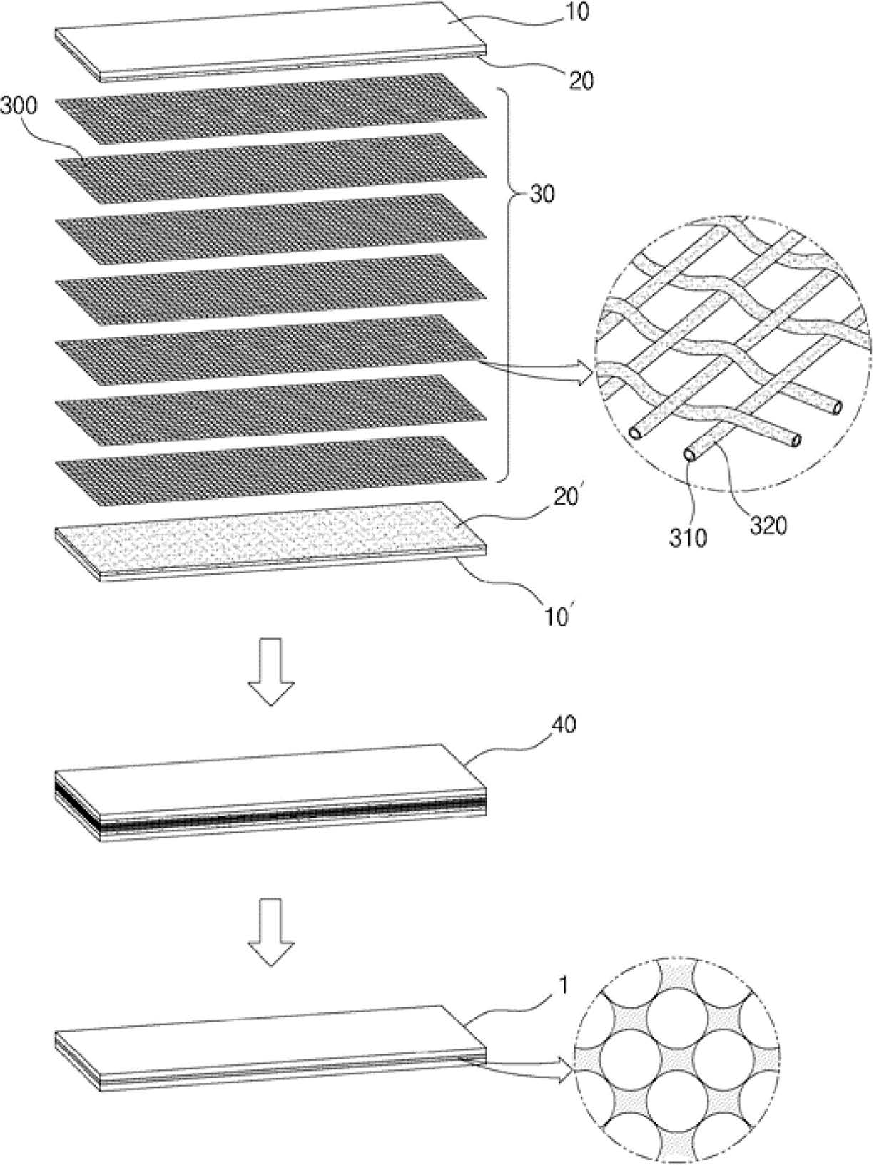 Structure of fiber metal laminate. 10 & 10’ : aluminum alloy, 20 & 20’ : EVA-based adhesive film, 30 & 300 : prepreg, 40 : hybrid metal composite, 1 : hybrid metal composite after curing.