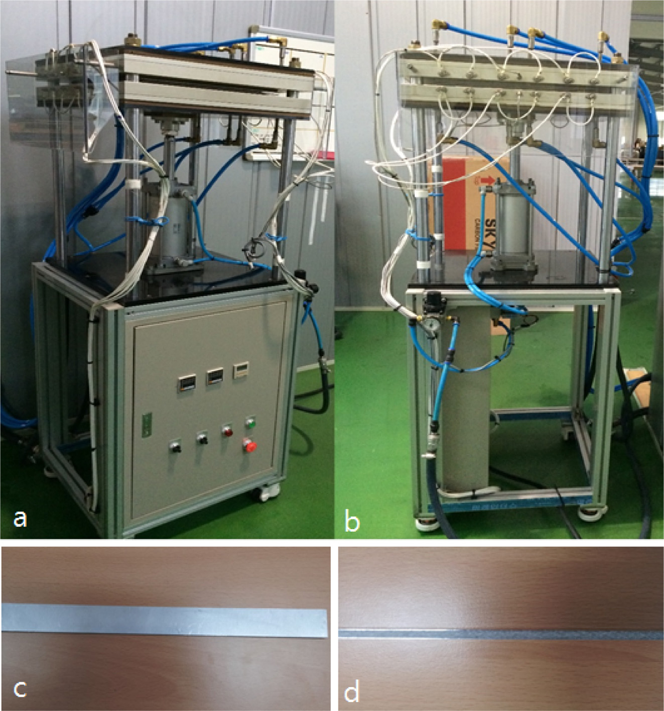 Photographic images of hot press (a: side view, b: front view) and produced FML specimen (c: top view, d: side view; dimension: 30 cm×2.5 cm).