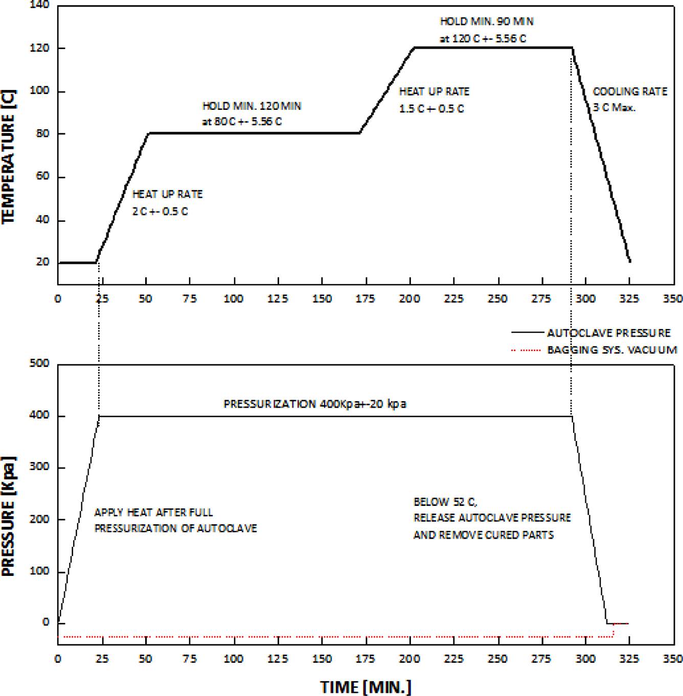 For the autoclave method, the specimen as shown in Table 2 were prepared in the autoclave (infinite carbon) according to the processing condition (Figure 3). Briefly, after maintaining at room temperature for a certain period of time, the temperature is increased from 2 ℃ per minute to 80 ℃, and then maintained for about 120 min. Thereafter, the curing process is performed by raising the temperature to 1.5 ℃ per minute to 120 ℃, holding it for about 90 min, and then cooling at a rate of 3 ℃ at the maximum (total processing time: ~5 h and 30 min).
