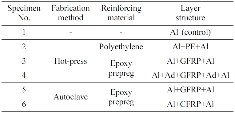 Aluminum alloys are widely used in various types of industrial applications due to lightweight and high strength structural materials, but they have limitations in enhancing mechanical strength and toughness. To overcome these limitations, fiber metal laminates (FMLs) using fiber reinforced materials have been developed, which are environmental-friendly in regarding for reduction of energy consumption in weight and fuel cost because it is lighter but stronger than conventional metal materials.1-3 Since their development at the Delft University of Technology in the Netherlands for modern commercial aircrafts, they are constantly gaining attentions from the industry and the academy as well.4,5