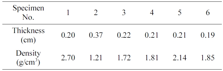 Specimen Fabrication and Physical Properties. First, FML specimens were fabricated by the hot press (specimen 2, 3 & 4) and the autoclave (specimen 5 & 6). To compare physical and mechanical properties of the specimens, the density, tensile strength & elongation, flexural and peel adhesion strength of each specimen were measured and compared. As controls, aluminum alloy itself (specimen 1) was used and aluminum composite laminated with polyethylene (PE) (specimen 2) as a reinforcing material was also used to compare the properties of the FMLs.