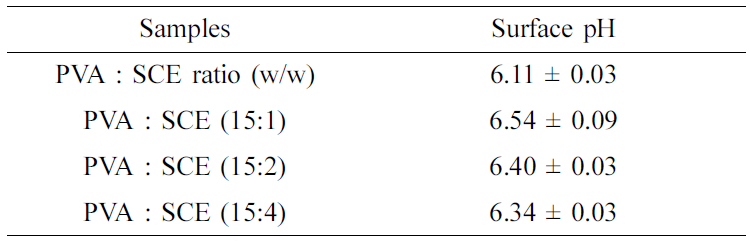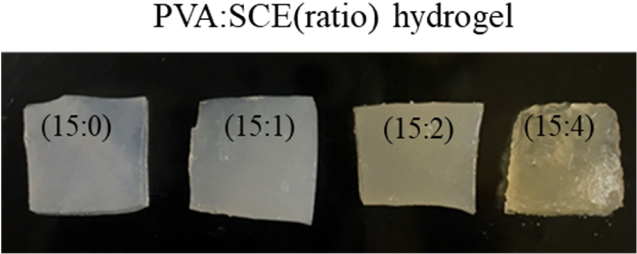 하이드로젤 형태. PVA와 KG의 농도를 각각 15%와 0.1%로 고정시킨 후 SCE의 농도를 달리하여 증류수에 용해시켜 젤을 제조하였다. 동결-융해 과정을 거쳐 만들어진 하이드로젤은 모두 불투명한 색을 띠었으며 SCE의 함량이 증가할수록 황색이 짙어지는 것을 확인하였다(Figure 1).