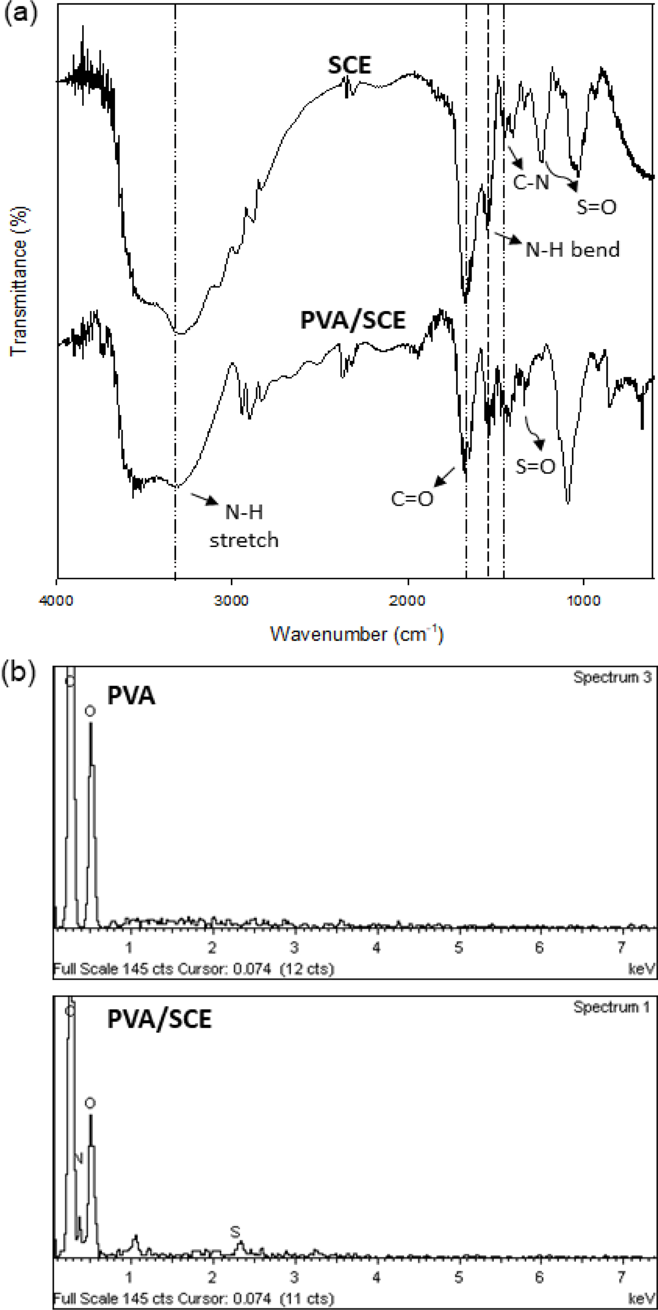 Figure 2. (a) FTIR spectra of PVA/SCE hydrogel in comparison with the spectra of pure SCE; (b) EDS spectra of PVA/SCE hydrogel in comparison with PVA hydrogel, which confirm the presence of chondroitin sulfate in the foams.