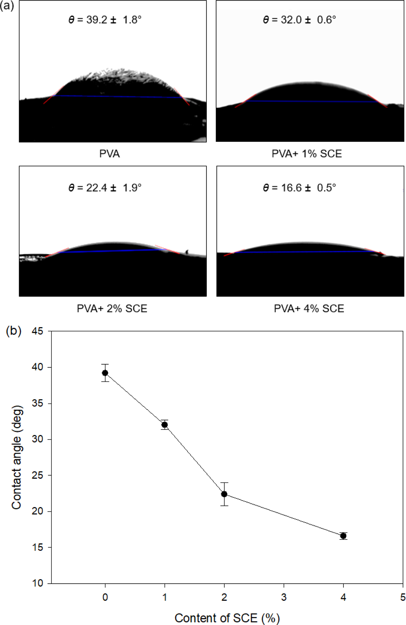 Figure 3. (a) Photographs of a water droplet on the surface of the PVA/SCE hydrogels; (b) contact angles of the surface of the PVA/SCE hydrogel versus SCE weight proportion.