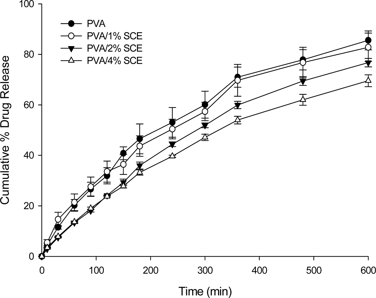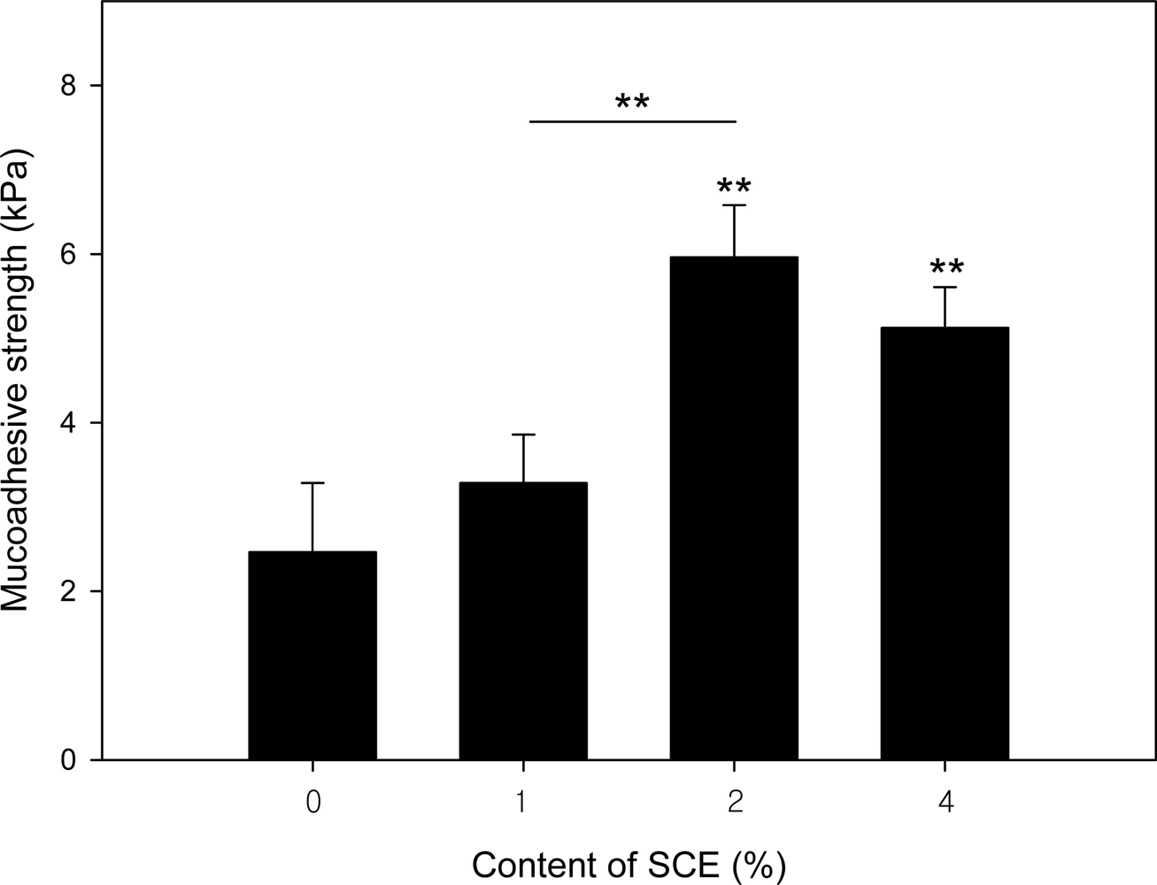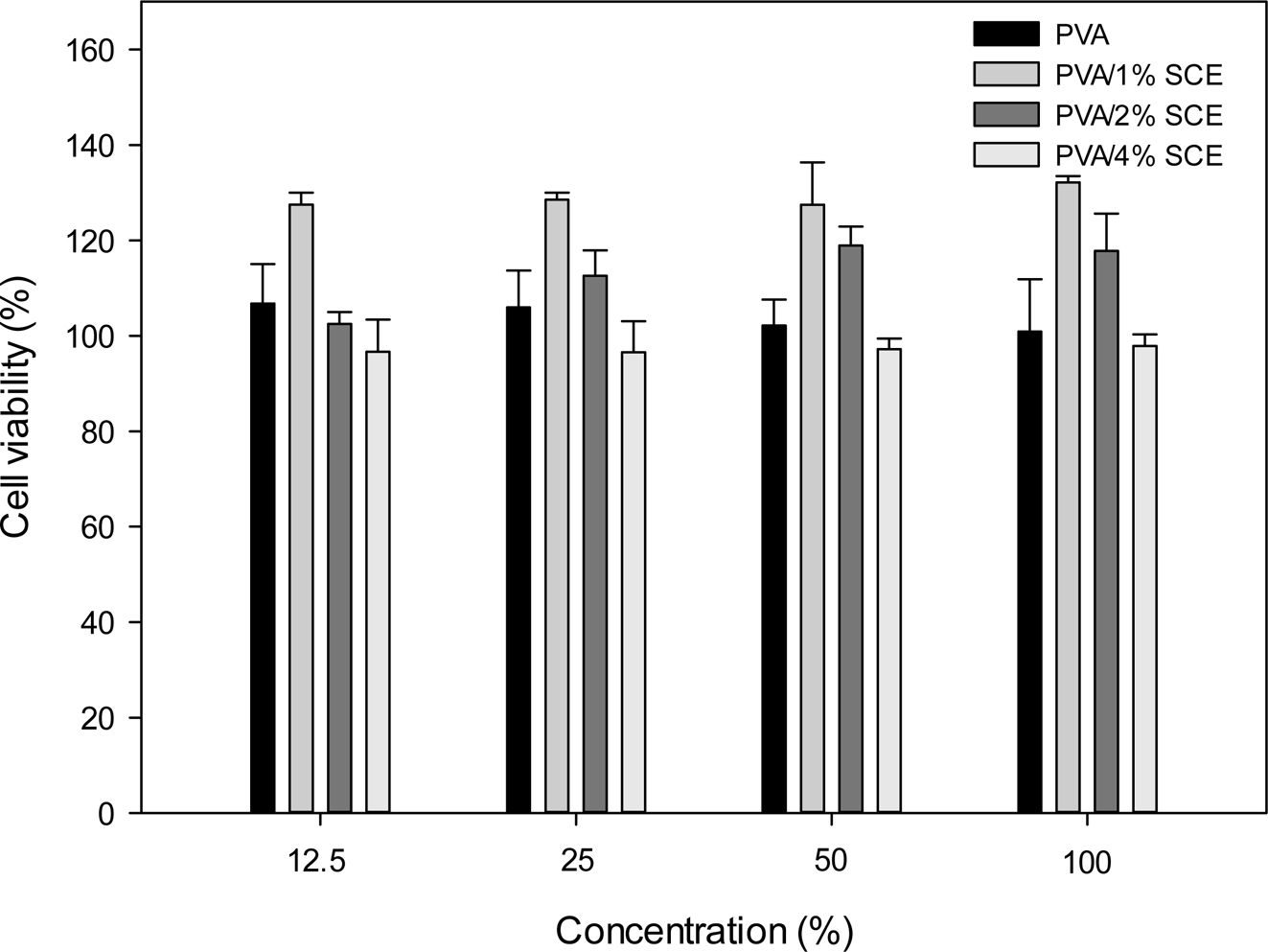 FTIR, EDS 분석. 제조한 PVA/SCE 하이드로젤의 구조적 특성 확인을 위해 FRIR을 사용하여 분석한 결과는 다음과 같다(Figure 2). SCE에서 chondroitin sulfate가 나타내는 특징적인 피크와 단백질에서 관찰되는 피크가 관찰되었다. Chondroitin sulfate의 3280 cm-1(–OH group), 3100 cm-1(–N–H stretching), 1660 cm-1(–C=O stretching), 1560 cm-1(N–H bending vibration), 그리고 1240 cm-1(R–OSO2–O−)가 확인되었다.28 PVA/SCE 하이드로젤에서 –N–H stretching, N–H bending vibration, C-N stretching, R–OSO2–O stretching이 각각 3308, 1560, 1456, 1248 cm-1에서 나타났다. 또한 EDS 분석을 통해 PVA 하이드로젤에 존재하지 않는 PVA/SCE 하이드로젤에서 S(황), N(질소)의 피크를 추가적으로 확인하였다. FTIR 및 EDS 결과는 PVA/SCE 하이드로젤 내 chondroitin sulfate의 존재를 통해 PVA 하이드로젤에 chondroitin sulfate의 성분을 확인할 수 있었다. 표면 pH. 산성 또는 알칼리성의 pH는 구강 점막에 자극을 유발할 수 있으며 약물방출 및 고분자의 수화도에 영향을 줄 수 있다. 조성별로 제조한 PVA/SCE 하이드로젤 표면의 pH를 측정한 결과 모두 타액의 pH에 가까워 구강점막에 대한 자극성은 낮은 것으로 판단하였다(Table 1). 접촉각 측정. PVA/SCE 하이드로젤의 습윤성을 알아보기 위해 접촉각 측정 결과를 Figure 3과 같이 나타내었다. 친수성인 중합체일수록 높은 계면 자유 에너지로 인해 계면과 친밀한 접촉이 이루어지고, 이는 접촉각을 낮추게 한다.10 PVA/SCE 하이드로젤의 SCE의 함량이 높을수록 하이드로젤에 접촉된 물방울의 퍼짐현상과 함께 접촉각이 감소하는 경향을 보였다. 이는 카복실기와 설페이트 그룹으로 인해 강한 음전하를 띠고 있는 chondroitin sulfate가 PVA 수용액에서 물분자와의 수소결합 수를 증가시키기 때문이라고 사료된다. 이를 통해 PVA 수용액에 SCE의 함량이 증가할수록 하이드로젤의 수분 함유량을 증가시켜 친수성을 향상시켰음을 알 수 있었다. 하지만, 과도한 수분은 점착 없이 미끄러운 점액만을 형성한다.29 생체점착강도 측정. 생체 내 최대 점막점착력을 확인하기 위해 UTM을 사용하여 제조한 하이드로젤의 구강 점막에 대한 점착강도를 측정하였다(Figure 4). PVA 하이드로젤의 점막점착력은 2.46±0.82 kPa로 가장 낮았으며 SCE의 함량이 1%에서 2%로 증가함에 따라 3.29±0.57에서 5.96±0.62 kPa로 증가하였다. 그리고 SCE의 함량이 4%일 때는 5.12±0.48 kPa로써 점막점착력은 2%에서 최대를 보였다. Ahuja는30 최대의 점막접착력에 대한 최적의 중합체 농도가 있다고 밝혔다. 고도로 농축된 시스템에서는 최적의 농도를 넘으면 접착력이 현저하게 떨어진다.31 즉, 고농축 용액에서 나선형 분자는 용매가 부족해지고 상호 침투를 위해 이용 가능한 사슬 수가 제한되어 점착강도가 크게 감소한다.32 또한 PVA 수용액에 대한 SCE의 함량이 증가함에 따라 하이드로젤의 친수성은 증가하지만 2% 이상에서는 chondroitin sulfate의 가교수 증가에 따라 개별 고분자 사슬의 이동성이 떨어지고 점액층으로 침투할 수 있는 사슬의 유효 길이가 감소하여 생체점착강도 또한 감소시켰을 것이라 사료된다.31 따라서 최대 점막점착력을 갖는 PVA/2% SCE 하이드로젤은 높은 점막접착력으로 인해 약물 전달 시 약물의 체류 시간을 연장시킬 수 있을 것이라 판단된다. 약물방출 실험. HPLC를 사용하여 제조한 하이드로젤로부터 구내염 치료약물인 KG의 약물방출 실험을 진행하였다. 실험결과 PVA/SCE 하이드로젤의 SCE 함량이 증가함에 따라 방출속도가 감소하였다(Figure 5). 이는 SCE가 약물과 하이드로젤 매트릭스 사이의 상호작용을 향상시켜 방출량 및 방출속도를 감소시켰을 것이라 사료된다. 세포독성 평가. 구내염 약물이 담지된 PVA/SCE 하이드로젤을 농도별로 세포독성을 분석하기 위하여 각 조성을 일정시간 용출시키고 실험에 사용하였다. 각 조성에 따른 하이드로젤의 농도별 용출액은 모든 농도에서 80% 이상으로 독성이 거의 없었다(Figure 7). 본 실험에 이용된 PVA/SCE 하이드로젤은 세포 독성이 없는 생체 소재로 체내 삽입이 가능하며, 다양한 종류의 약물을 담지시킨 약물담지시스템으로 응용 가능할 것으로 사료된다. Nitric oxide 소거능 측정. Nitric oxide(NO)는 생체 내에서 중요한 세포신호전달물질로서 작용하나 과잉 생산 시 산화적 스트레스의 유발을 통해 염증 및 세포 손상의 원인이 된다.33 대식세포가 lipopolysaccharide(LPS)로 자극되면 inducible nitric oxide synthase(iNOs)의 발현에 영향을 주어 많은 양의 NO를 발생시킨다. PVA/SCE 하이드로젤이 유발된 RAW 264.7 세포의 NO 생성에 미치는 영향을 분석하였다(Figure 7). 실험군으로 PVA/2% SCE 하이드로젤의 용출물을 사용하였다. LPS를 처리한 후 NO의 생성량은 45.17±5.37에서 275.60±9.48 μM로 약 6배 이상 증가되었다. 하이드로젤 용출물의 농도를 12.5, 25, 50, 100%로 세포에 처리하여 NO 소거능을 측정하였다. KG가 첨가되지 않은 PVA/2% SCE 하이드로젤은 각각 141.5, 125.0, 123.0, 114.0 μM로 측정되었다. KG가 첨가된 PVA/2% SCE 하이드로젤은 26.8, 21.3, 24.1, 23.6 μM로 KG의 항염 효과로 인해 더 높은 NO 소거능을 보였다. PVA/2% SCE 하이드로젤은 모든 농도에서 NO 형성이 억제되었으며, 농도가 증가함에 따라 NO 소거능도 증가한 것을 볼 수 있었다