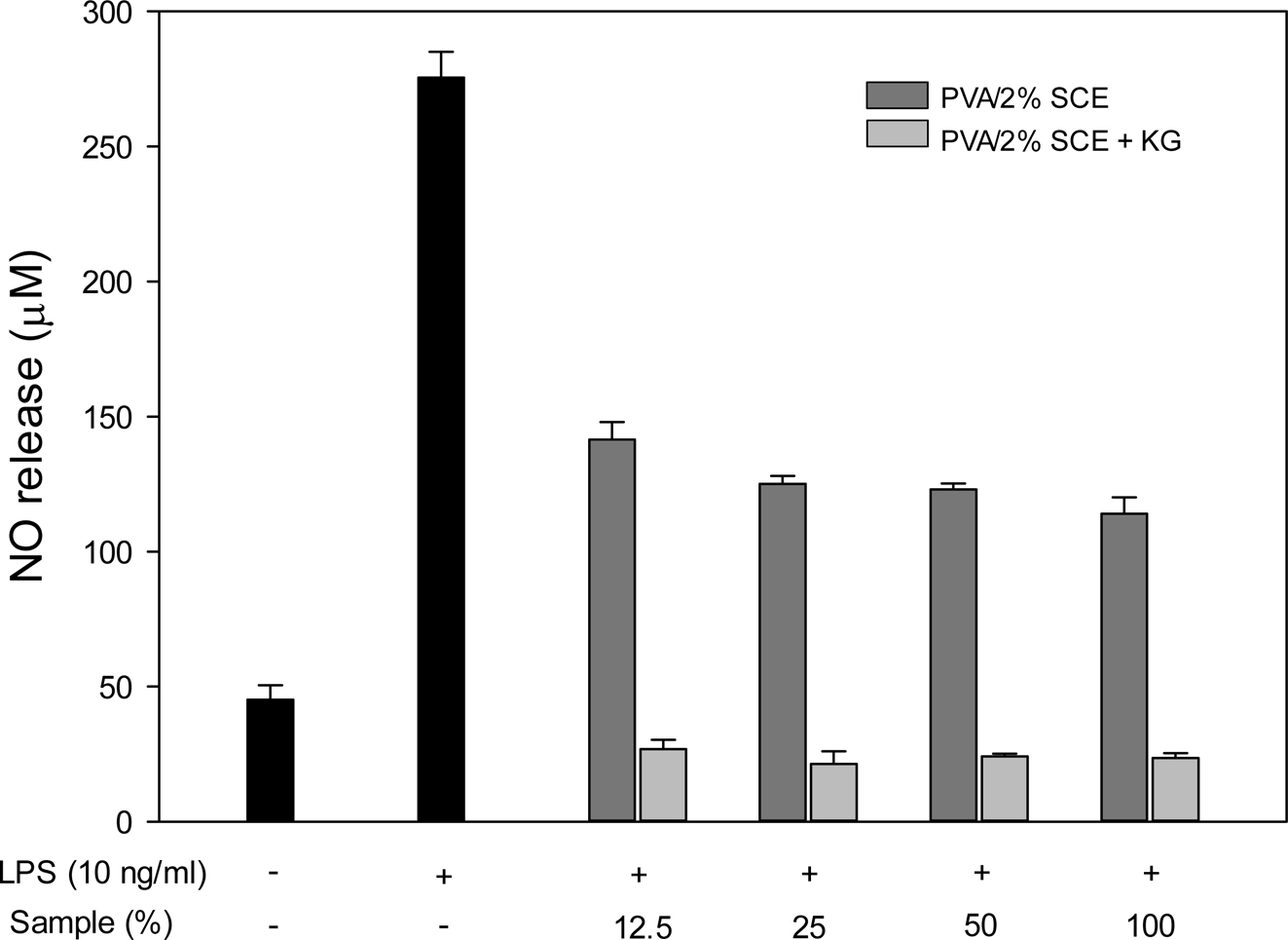 Figure 7. Effect of the extracts of PVA/2% SCE hydrogel and PVA/2% SCE hydrogel containing KG on nitric oxide production from RAW 264.7 cell treated with LPS.