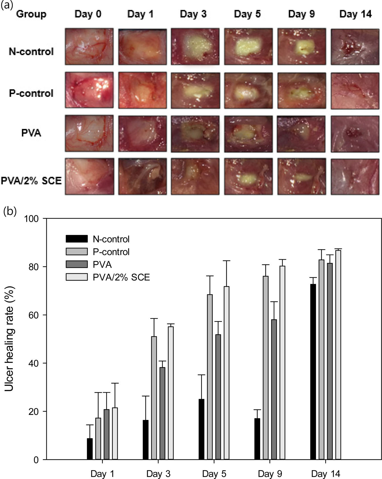 시약 및 재료. 본 실험에서 사용한 poly(vinyl alcohol)(PVA, Mw 85000-124000, fully hydrolyzed)는 Sigma Aldrich Co., Ltd(St. Louis, MO, USA)에서, dipotassium glycyrrhizinate (KG)는 TCI Co., Ltd(Tokyo, Japan)에서 구입하여 사용하였다. 상어 연골은 영천돔배기(Gyeongbuk, Korea)에서 구입하였다. 양성 대조군은 glycyrrhizinate 약물이 함유된 필름 형태의 구내염 치료제인 Taisho®-A(Taisho Pharmaceutical Co., Ltd, Japan)을 사용하였다. 그 밖의 시약은 정제과정 없이 사용되었으며 증류수는 3차 증류수를 사용하였다. 상어 연골 추출물 제조. 3 kg의 상어 연골을 물로 헹궈 핏물을 제거한 후 0.2 N acetic acid 수용액에 6시간 동안 침지시켰다. 침지시킨 상어 연골을 꺼내어 12시간 동안 흐르는 물에 중화시켰다. 가열 용기에 상어 연골 무게 10배의 물을 채워 가열한 후 가열과정에서 생성되는 불순물을 채로 걸렀다. 일정량으로 농축되면 가열을 멈추고 식힌 뒤 12000 rpm에서 15분간 원심 분리하여 상층액을 채로 걸러 정제하였다. 이 후 -70 ℃에서 냉동시킨 뒤 동결건조하였다. 동결건조된 추출물을 분쇄기에 갈아 분말 형태로 만들어 실험에 사용하였으며 이 추출물을 SCE(shark cartilage extract)라고 명명하였다. PVA/SCE 하이드로젤 제조. 예비실험으로 PVA를 5, 10, 15%로 하여 하이드로젤을 제조한 후 UTM을 이용하여 기계적 물성을 측정하였다. 하이드로젤을 구내에 처치하였을 때 오랜기간 동안 형태를 유지하면서 염증 부위에 약물을 방출할 수 있도록 가장 물성이 높은 15%의 PVA를 선택하였다. 15%의 PVA를 90 ℃에서 천천히 교반시키면서 1시간 동안 용해시킨 후 121 ℃의 고압멸균기(AC-13, Lab. Companion, Korea)를 이용하여 용해시켰다. PVA 용액에 SCE의 농도가 0, 1, 2, 4 wt%가 되도록 고정한 후, 0.1 wt% dipotassium glycyrrhizinate을 첨가 후 용해시켰다. 조성별로 제조된 PVA/SCE 용액에 petri dish에 붓고 기포를 제거한 뒤 -70 ℃에서 3시간 동결 후, 상온에서 6시간 해동하여 하이드로젤을 제조하였다. FTIR, EDS 분석. 작용기 분석을 위해 SCE, PVA/SCE 하이드로젤을 푸리에 변환 적외선 분광기(FTIR)을 이용하여 4000~600 cm-1의 파장영역에서 측정하였다. 또한 정밀한 성분분석을 위해 하이드로젤을 에너지분산 X-선 분광계(EDS)를 이용하여 원소분석을 실시하였다. 표면 pH. PVA/SCE 하이드로젤의 표면 pH를 측정하기 위해 각 조성당 5개의 시료를 준비하여 pH 6.8 인산염 완충액이 담긴 petri dish에 120분 동안 침지시켰다. 팽창된 하이드로젤의 표면 pH는 pH Meter(8100, ETI Ltd., UK)를 사용하여 측정하였다. pH Meter의 전극을 하이드로젤의 표면에 접촉시킨 후 1분 동안 평형을 이루게 한 후에 측정하였다.27 접촉각 측정. PVA/SCE 하이드로젤의 습윤 특성을 알아보기 위해 contact angle analyzer(Phoneix-Smart, Surface Electro Optics, Korea)를 사용하여 접촉각을 측정하였다. 접촉각 측정기에 장착된 주사기에 증류수를 채워 사용하였고 접촉각 측정은 각도가 일정하게 유지될 때까지 기다린 후 측정하였다. 5회 반복하여 평균값을 사용하였다. 생체점착강도 측정. UTM(universal testing machine, TO-102D, Test one, Korea)을 사용하여 하이드로젤의 구강 점막에 대한 점착 강도를 측정하였다. 햄스터로부터 구강점막을 채취한 후 멸균생리식염수로 세척하여 사용하였다. 채취한 구강점막을 cyanoacrylate adhesives(Sigma Aldrich, USA)를 사용하여 인장시험기의 상단과 하단에 부착시켰다. 시험물질의 크기는 1 cm×1 cm로 준비하였고 부착된 두 개의 점막과 5분 동안 접촉시켰다. Loadcell은 10 kgf, cross head의 속도는 10 mm/min으로 설정하였고 시험물질과 점막이 완전히 분리될 때까지 측정하였다. 본 실험은 전남대학교 용봉캠퍼스 동물실험윤리위원회에서 승인을 받아 시행되었다(CNU IACUC-YB-R-2017-66). 약물방출 실험. KG를 포함하는 하이드로젤을 pH 6.8 phosphate buffer에 넣고 방출되는 약물을 측정하였다. Shaking incubator(HB-201SF, Hanbaek Co., Korea)에서 속도는 100 rpm, 온도는 37 ℃로 유지하면서 일정 시간마다 1 mL의 방출 용액을 채취한 후 동량의 fresh buffer를 보충해주었다. 방출 용액에 함유된 약물의 농도는 HPLC로 측정하였으며, KG를 pH 6.8 phosphate buffer에 용해시켜 HPLC로 분석하여 농도와 피크면적으로부터 검량선을 작성하였다. 세포독성 평가. 세포 생존율을 측정하기 위해 MTT assay을 실시하였다. NIH-3T3 섬유아세포는 37 ℃, 5% CO2 incubator에서 배양하였으며 10% FBS와 1% Pen Strep이 첨가된 DMEM 배지를 사용하였다. 96 well plate에 배양된 NIH-3T3 세포를 5×104 cells/mL 만큼 분주하고 24시간 동안 배양하였다. ISO 10993-12에 의거하여 제조한 PVA/SCE 하이드로젤을 DMEM 배지에 담가 37 ℃에서 24시간 용출액을 사용하였다. 용출액을 농도별로 희석하여 배양된 세포에 처리하였다. 24시간 후 0.5% MTT(3-[4,5-dimethylthiazol-2-yl]-2,5-diphenyl tetrazolium bromide)용액을 각 well에 20 μL씩 처리하여 37 ℃에서 4시간 동안 배양하였다. 이 후 MTT 용액과 배지를 제거하고 DMSO 100 μL을 첨가한 후 ELISA reader(Bio-Tek, USA)을 이용하여 570 nm 파장에서 흡광도를 측정하였다. Nitric Oxide 소거능 측정. 항염 효과를 확인하기 위해 Nitric Oxide asaay를 실시하였다. 96 well plate에 배양된 RAW 264.7 세포를 5×104 cells/mL 만큼 분주하고 10% FBS와 1% Pen Strep이 함유된 DMEM 배지에서 37 ℃, 5% CO2 조건
