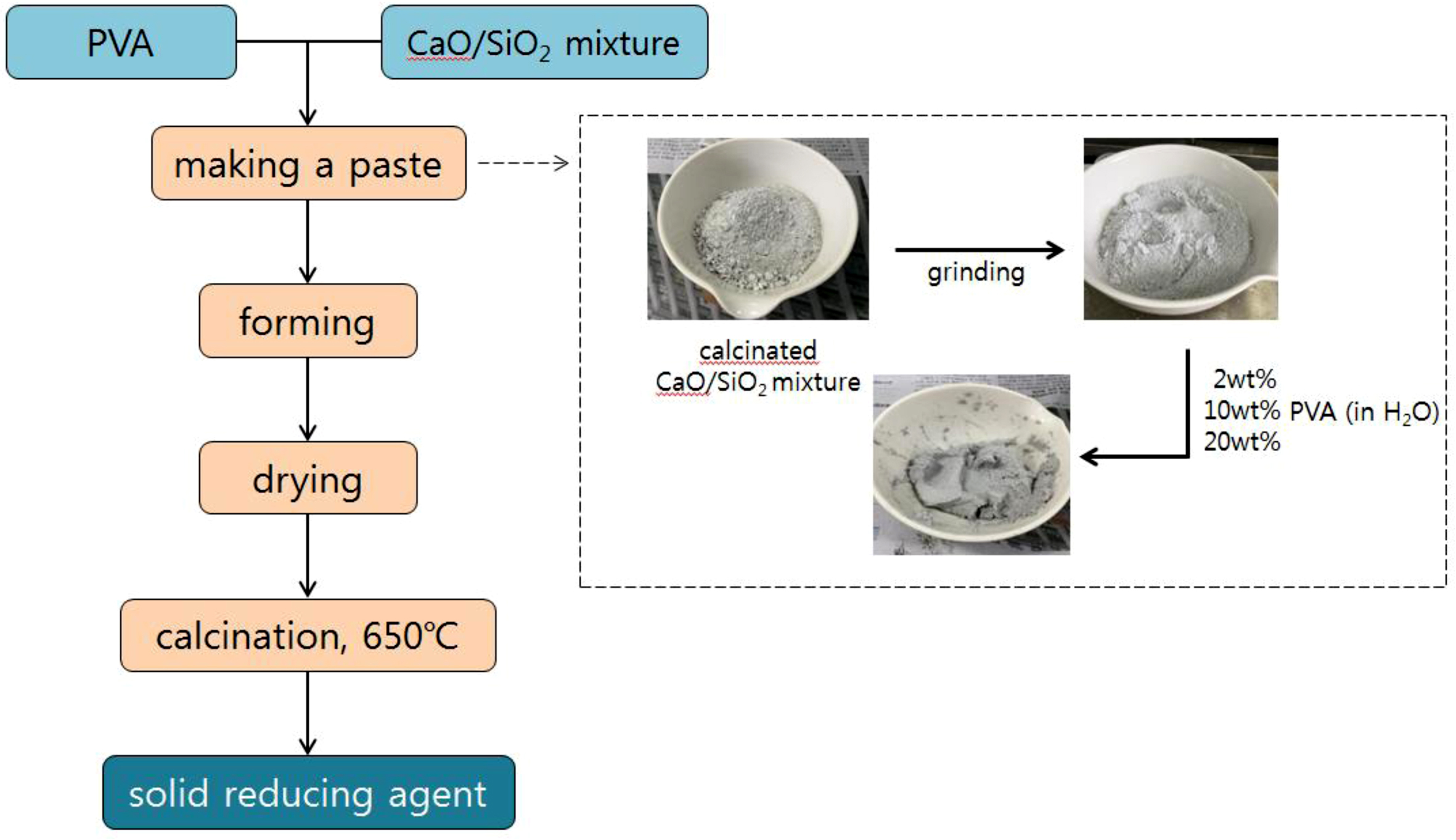 고형환원제의 제조. 고형환원제를 성형하기 위해 소성이 완료된 CaO/SiO2 혼합물에 고분자 바인더를 사용하였다(Figure 3). 고분자 바인더로는 중량평균분자량이 9000~10000, 31000~50000 그리고 146000~186000인 PVA를 사용하였고, 바인더 용액 제조를 하기 위해 각각 2, 10 그리고 20 wt%의 농도로 증류수에 바인더를 용해시켰다. 이 용액에 소성된 CaO/SiO2 혼합물을 넣고 혼합하여 반죽상태로 만든 다음 구형의 입자상태로 제조한 후 상온에서 12시간 동안 건조시켰다. 건조가 완료된 입자상의 성형물은 소결로에서 용매와 바인더를 제거하기 위하여 650 ℃에서 4시간 동안 각각 소성하였다(Figure 4). 위와 같은 방법으로 제조된 각각의 고형환원제의 명칭은 CaO/SiO2 혼합물과 바인더의 혼합 조성비 및 바인더 종류와 분자량에 따라 정리하여 Table 1에 나타내었다.
