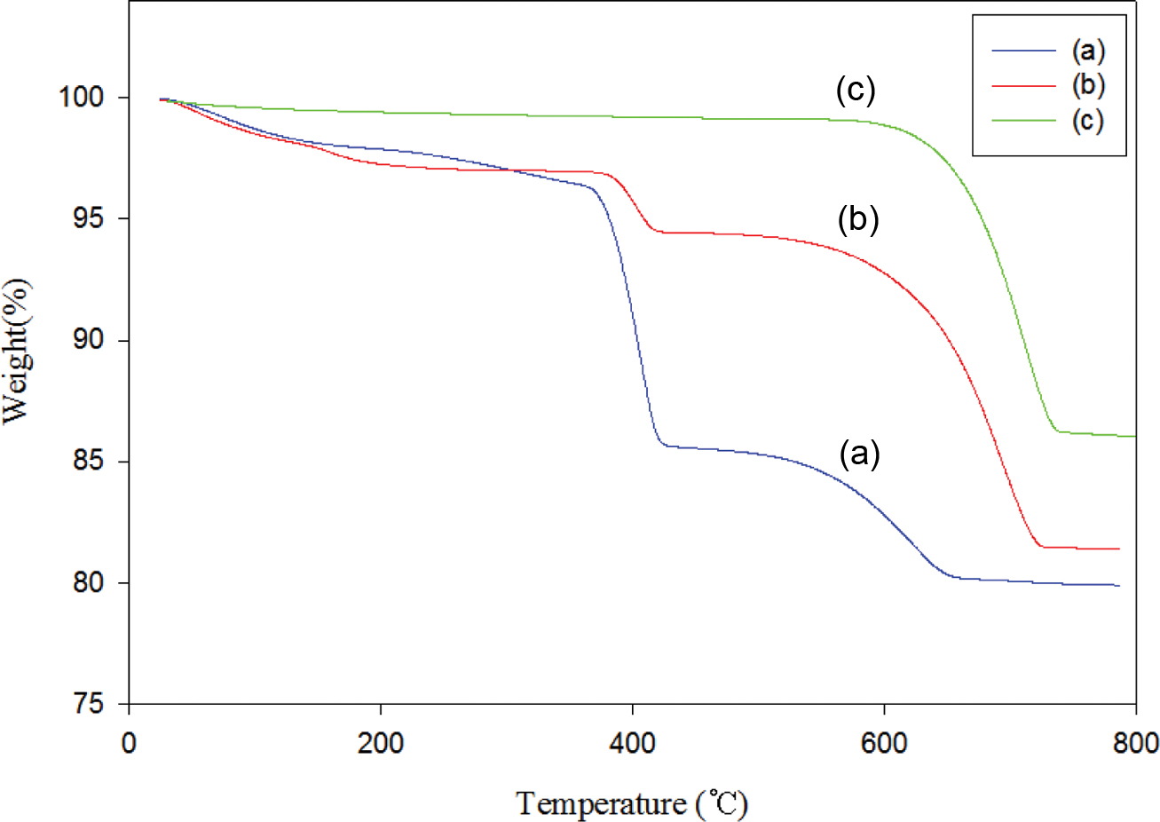 고형환원제의 출발물질인 Ca(OH)2/SiO2 혼합물과 바인더를 사용하여 제조된 고형환원제의 소성전후의 열적특성을 알아보기 위해 Figure 5에 TGA 곡선들을 나타내었다. Figure 5(a) 곡선은 Ca(OH)2의 함량이 60 wt%이고 SiO2의 함량이 40 wt%인 Ca(OH)2/SiO2 혼합물의 1차 소성 후 얻어진 CaO/SiO2 혼합물에 대한 열곡선이고, Figure 5(b)와 (c) 곡선은 각각 Ca(OH)2/SiO2 (60 wt%/40 wt%) 혼합물을 1차 소성한 후 얻어진 CaO/SiO2 혼합물에 분자량이 31000~50000인 PVA 바인더 2 wt%를 사용하여 제조한 고형환원제(60-2PVA50K)의 소성 전과 소성 후의 열곡선이다. 각각 100~200 ℃ 사이에서 일어나는 중량감소는 Figure 5(a) 곡선의 경우, 용매로 사용한 IPA와 대기 중에 흡착된 수분이 제거되어 중량이 감소한 것으로 판단되고, Figure 5(b) 곡선은 PVA에 흡착된 물 손실로 인한 중량감소,15 그리고 Figure 5(c) 곡선의 경우도 마찬가지로 고형환원제에 흡착된 대기 중의 수분이 제거된 것으로 판단된다.16-18 고형환원제의 출발물질로 사용된 Ca(OH)2는 410 ℃ 부근에서 CaO와 H2O로 분해되며, 이는 Figure 5(a) 열곡선에서 보는 것처럼 350 ℃부터 큰 중량손실을 보여주며 424 ℃에서는 85.7 wt%의 잔여량을 확인할 수 있었다. 또한 450~650 ℃ 사이에서의 중량감소 곡선은 화학 흡착된 물의 제거에 의한 것으로 판단된다.19 Figure 5(b) 열곡선에서 바인더로 사용된 PVA는 180 ℃부터 서서히 분해가 시작되어 360 ℃부터 420 ℃의 온도에서 중량손실을 보여주는데, 이는 곁사슬에 붙어있는 작용기가 서서히 분해되기 시작하면서 300 ℃ 이후엔 주사슬의 열분해가 일어난 것으로 해석된다.20 바인더 함량을 2 wt%로 사용했을 때 초기 PVA에 흡착된 물에 의한 중량 감소를 제외하고 main weight loss를 계산해 보면, 2.3%로 중량 손실과 거의 일치하는 것을 확인할 수 있었다. 그리고 열처리에 의한 PVA의 완벽한 제거는 Figure 5(c)에서 보는 바와 같이 550 ℃ 이하에서는 어떠한 변곡점을 보이지 않아 PVA가 열처리 됐음을 확인할 수 있었다. 그리고 Figure 5(b)와 (c) 곡선 둘 다 550~750 ℃ 사이에 큰 중량 손실을 보여주는데, 이는 탄산칼슘의 분해 온도로 앞에서 언급했듯이 고형환원제를 제조하는 과정에서 CaO가 공기 중에 노출되어 나타난 현상이라 보여진다.19 TGA 열분석 결과를 종합하여 본 실험에서는 혼합물의 소성온도와 바인더로 사용된 PVA를 제거함으로써 고형환원제의 기공률을 높이기 위한 소성온도를 650 ℃로 진행하였다.
