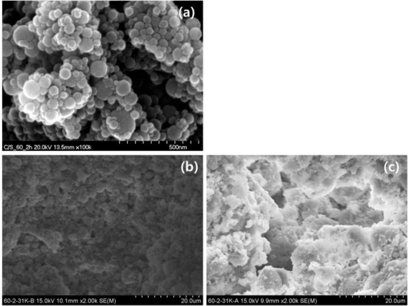 Figure 6은 Ca(OH)2/SiO2(60 wt%/40 wt%) 혼합물을 1차 소성한 후 얻어진 CaO/SiO2 혼합물(Figure 6(a))과 이에 바인더를 사용하여 제조된 고형환원제의 소성 전과 소성 후의 표면 모폴로지를 보여주는 SEM 이미지이다. Ca(OH)2/SiO2(60 wt%/40 wt%) 혼합물을 1차 소성한 후 얻어진 CaO/SiO2 혼합물에 분자량이 31000~50000인 PVA 바인더 2 wt%를 사용하여 제조한 고형환원제(60-2PVA50K)의 소성 전(Figure 6(b))의 경우 치밀한 표면을 관찰할 수 있고 반면, 소성 후(Figure 6(c))의 경우 2차 소성에서 PVA의 분해로 얻어진 표면의 다공성을 확인할 수 있었다. 제조된 구형 복합 구조체는 micro-pore 뿐만이 아니라 macro-pore를 형성하여 반응물의 유입이 용이한 다공성 구조체로서의 역할을 할 수 있음을 확인하였다. 또한 이러한 바인더의 도입은 고형환원제가 분말화되는 것을 억제하면서 비표면적을 크게 하여 궁극적인 흡착특성을 향상시킬 수 있으리라 사료된다.