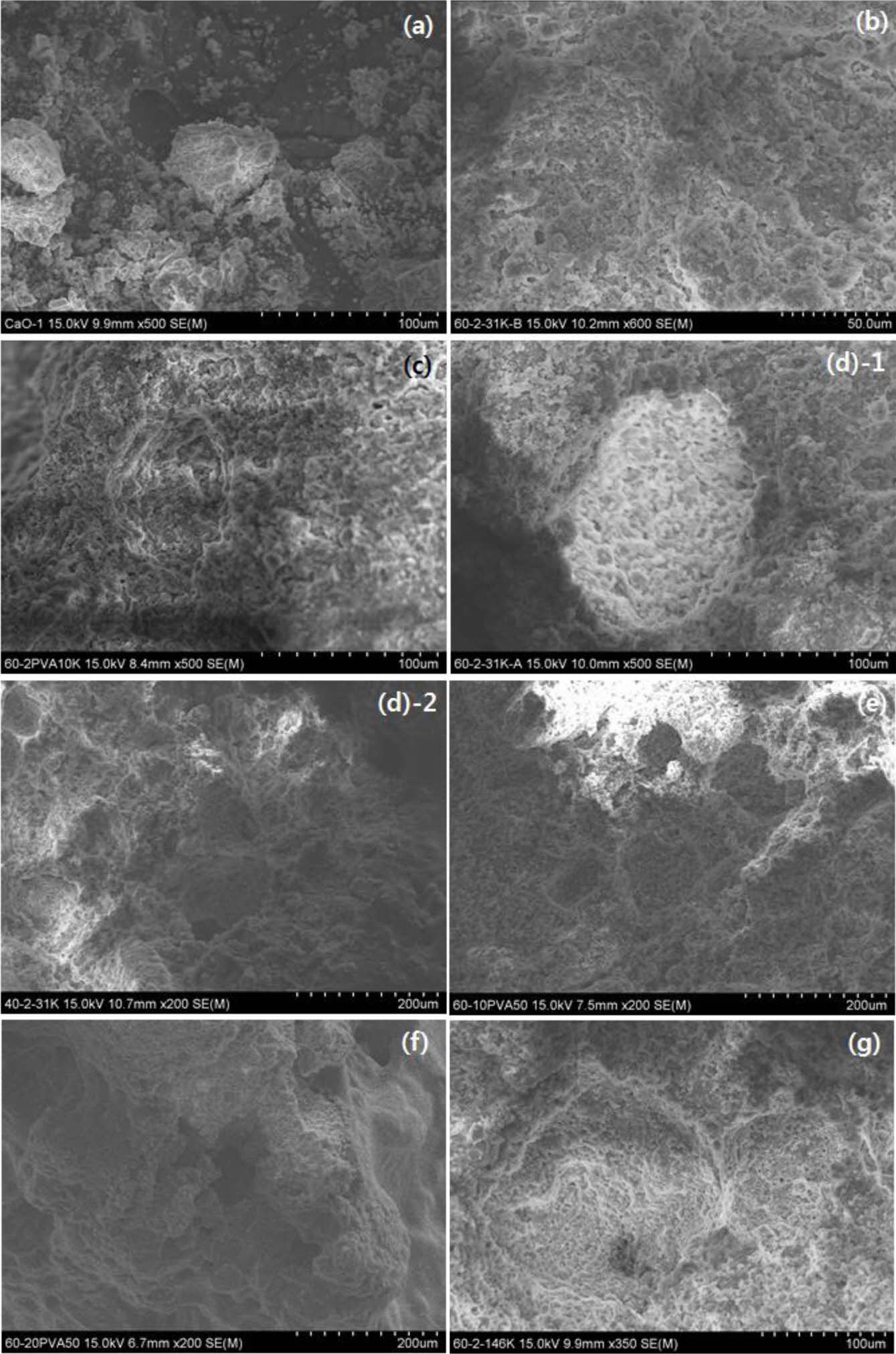 SEM images of the CaO and solid reducing agent sam-ples: (a) commercial CaO; (b) 60-2PVA50K before calcination; (c) 60-2PVA10K; (d) 60-2PVA50K ((d)-1: x500, (d)-2: x200); (e) 60-10PVA50K; (f) 60-20PVA50K; (g) 60-2PVA150K. (c)~(g) solidreducing agent samples were obtained by calcination.