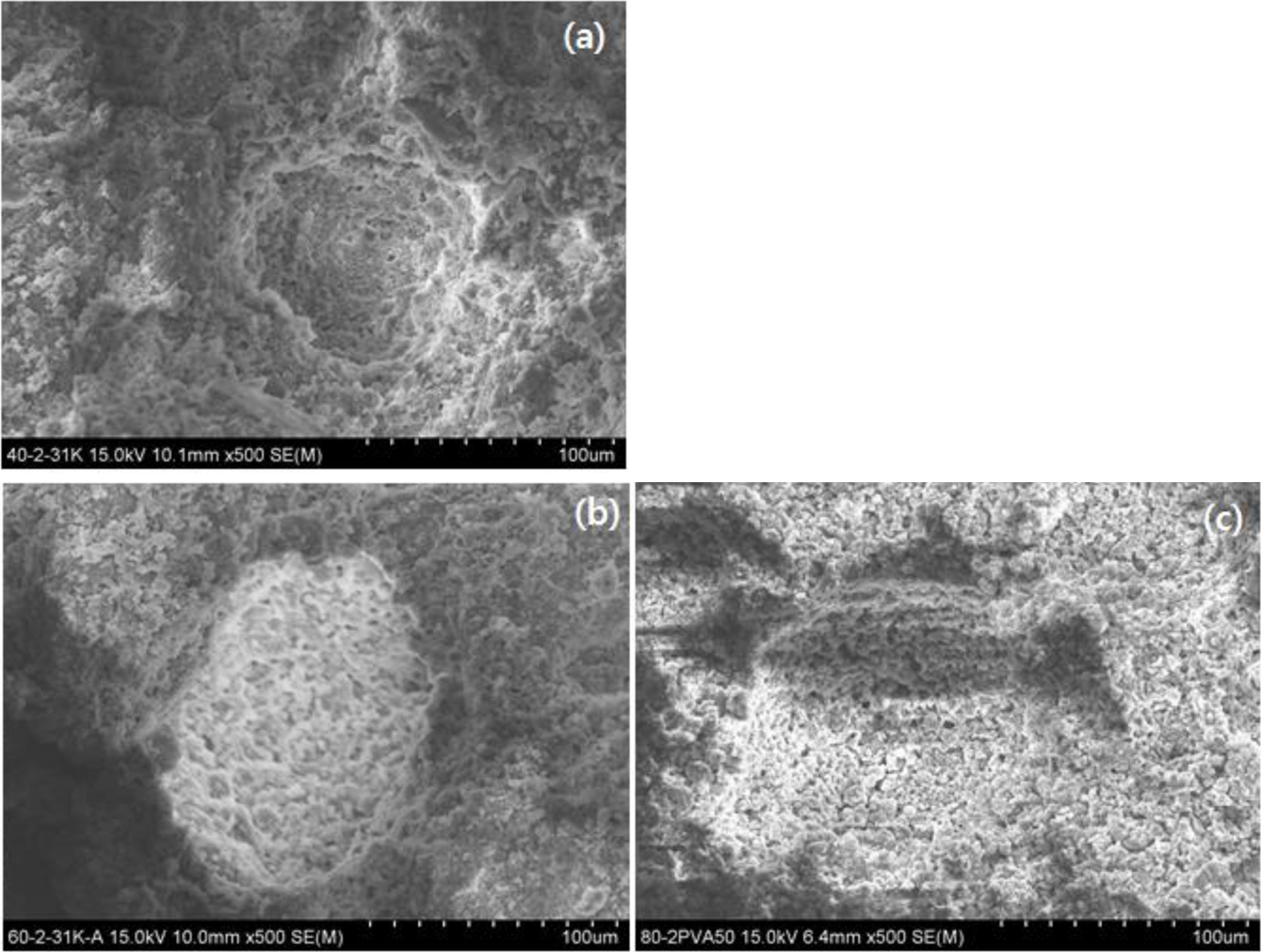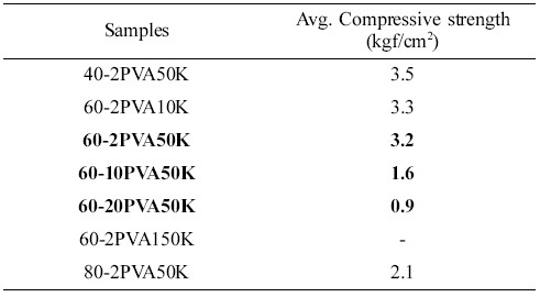 제조된 고형환원제의 강도측정을 위하여 압축강도를 측정한 결과를 Table 2에 나타내었다. 바인더로서 중량평균분자량이 31000~50000인 PVA 2 wt% 사용하고 Ca(OH)2/SiO2의 함량을 달리하여 제조된 고형환원제(40-2PVA50K, 60-2PVA50K, 그리고 80-2PVA50K)의 경우 비표면적이 큰 SiO2 (비표면적: 58.68 m2/g)의 함량이 60, 40, 그리고 20 wt%로 적어질수록 압축강도 값이 3.5에서 2.1 kgf/cm2으로 낮아짐을 확인하였다. 즉, Ca(OH)2의 함량이 많아질수록 소성 후 생기는 기공특성으로 인해 강도가 낮아지는 것으로 설명된다. 이는 SEM의 표면특성 및 BET에 의한 평균세공크기의 실험결과와도 일치한다. Ca(OH)2/SiO2를 60 wt%/40 wt%으로 하고, 바인더로서 중량평균분자량이 31000~50000인 PVA를 사용하여 제조된 고형환원제(60-2PVA50K, 60-10PVA50K, 그리고 60-20PVA50K)의 경우, PVA 함량이 2, 10 그리고 20 wt%로 증가할수록 소성 후 기공의 크기가 많아져 압축강도가 낮아짐을 확인하였다. PVA 함량은 2 wt%로 고정하고 PVA의 분자량의 크기에 따라 고형환원제의 압축강도를 비교한 결과, 분자량 ~10 K와 ~50 K는 3.3과 3.2 kgf/cm2로 비슷한 결과를 보였으나 ~150 K의 경우 육안으로 보았을 때는 형태를 충분히 유지하였으나 큰 분자량의 영향으로 압축강도를 특정할 수 없어 고형환원제로의 의미를 갖지 않는다고 할 수 있다.