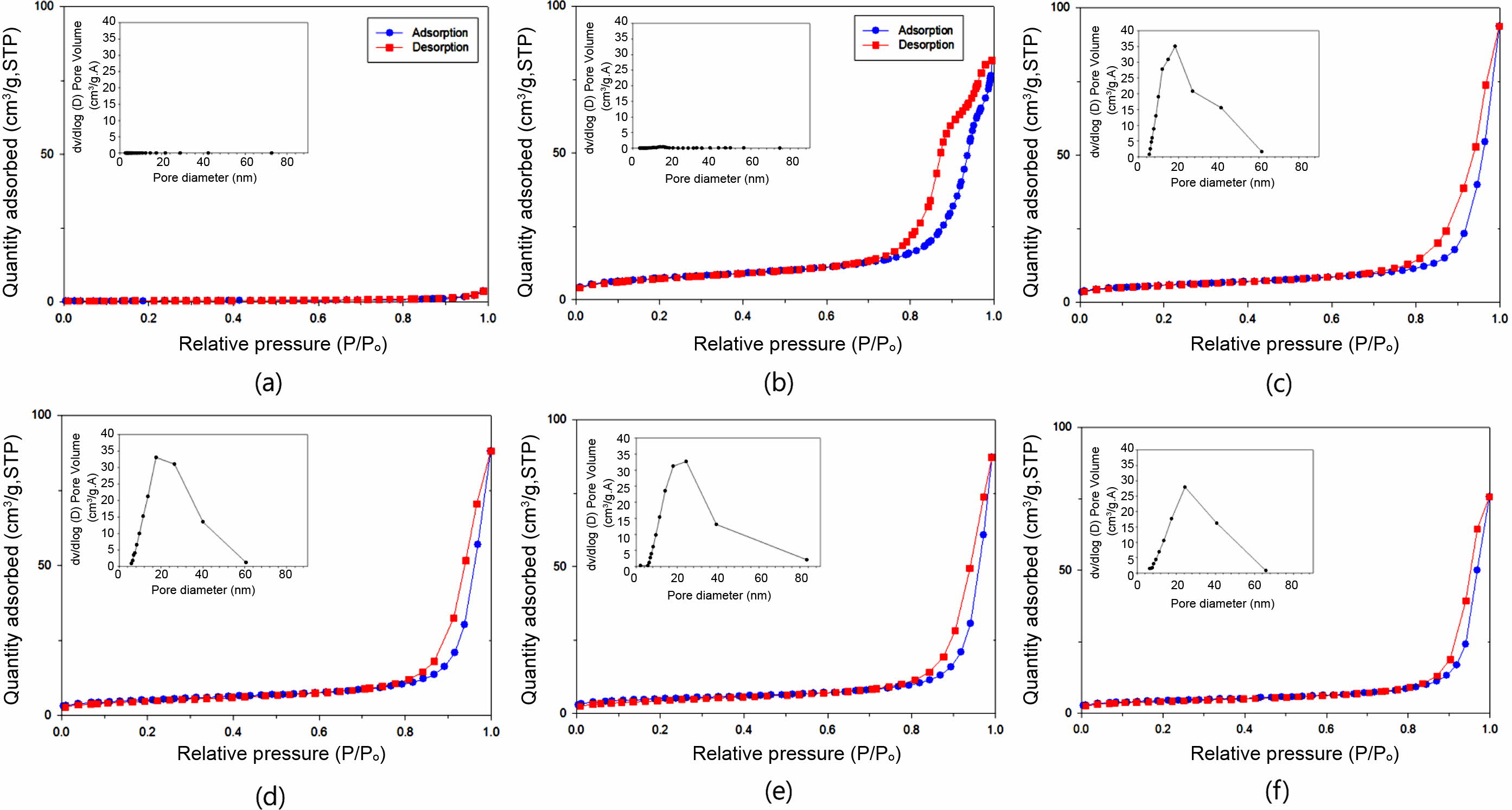 일반적으로 상업용 산화칼슘(CaO)은 비표면적이 2~4 m2/g으로 매우 작은 값을 갖는다. 흡착용 활성물질의 비표면적이 클수록 수분을 흡착하는 능력이 우수하나, 사용 가능한 기계적 물성과 흡착성을 위해서는 적절한 고비표면적을 만족하는 것이 바람직하다. Figure 9는 흡착제로서 바인더를 도입한 고형환원제의 비표면적을 살펴보기 위해 고형환원제들의 질소 흡착-탈착 등온선을 나타내었다. CaO/SiO2 혼합물의 조성비율과 바인더의 함량에 따른 고형환원제들의 비표면적(specific surface area, SSA), 총 세공부피(total pore volume, VT) 그리고 평균 세공직경(average pore diameter, DP)을 나타내었다(Table 3).