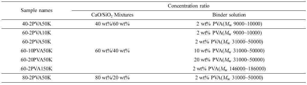 뿐만 아니라 CaO는 물이나 수증기를 접하면 심한 발열반응을 일으켜 분화하여 미립자 분말의 Ca(OH)2가 만들어지는데 이를 수화공정이라 한다. 순수 CaO보다 수화시켜 제조된 Ca(OH)2에서의 열분해로 생성된 CaO의 경우 넓은 비표면적으로 활성도가 높아져 반응성이 더 좋은 것으로 보고되었다. 이러한 특성을 이용하여 본 연구팀의 이전의 연구에서는 HF 제거용 고효율 고형환원제를 제조하기 위하여 지지체로서 소수성 실리카를 도입하고 열분해를 통하여 CaO/SiO2 혼합물을 제조하고 비표면적 특성 및 소수성의 최적화 조건 등을 고찰하였다.14 본 연구에서는 HF 제거를 위한 입자상 고형환원제를 제조하기 위해 다양한 분자량을 갖는 바인더를 도입하여 성형함으로써 기술의 차별화를 유도하였고 제조된 구형 복합구조체의 비표면적 특성 및 표면형상 등 그들의 특성을 고찰하고자 하였다.