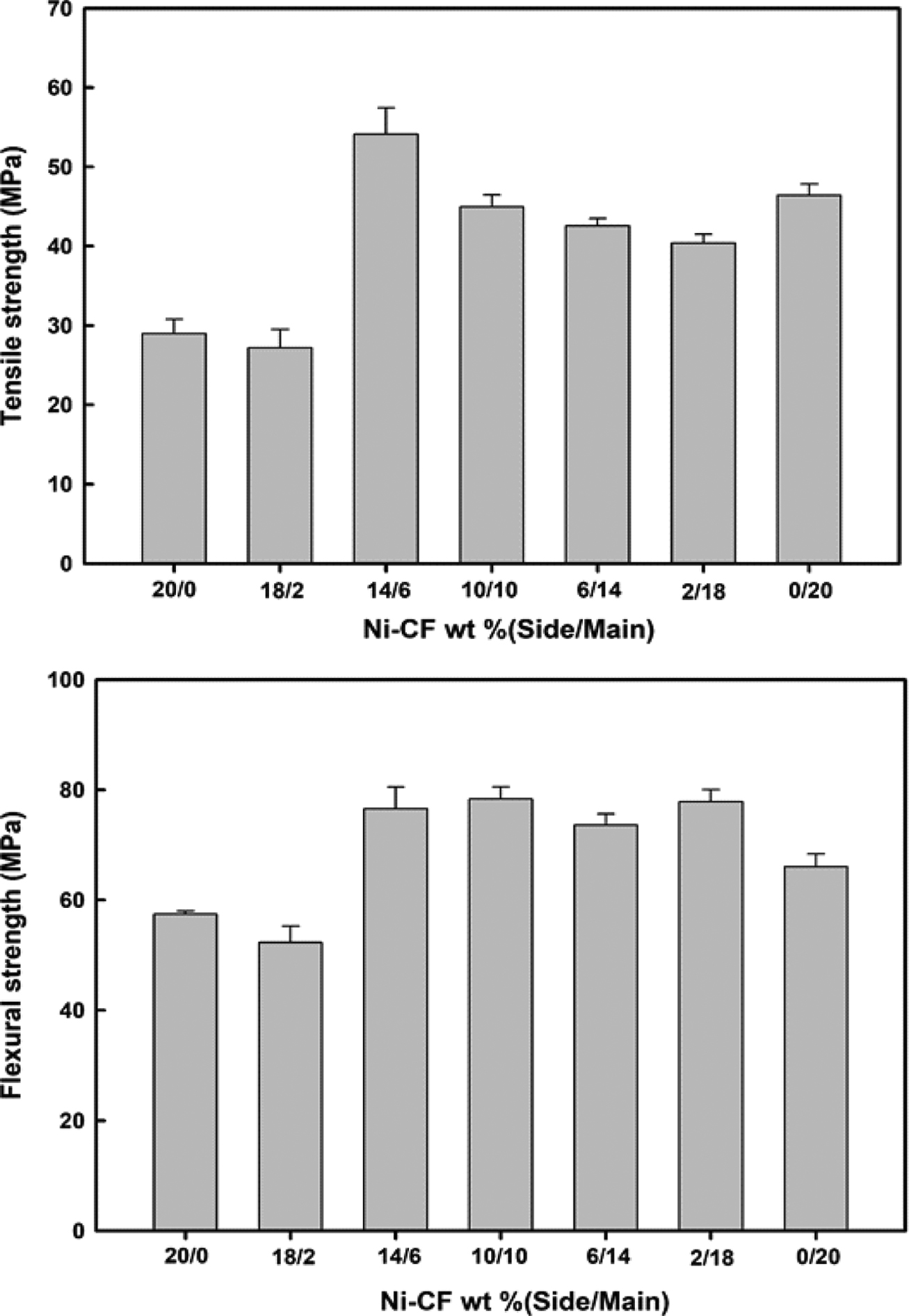 Figure 1은 Ni-CF의 부 투입구/주 투입구 비에 따른 복합체의 인장강도 및 굴곡강도를 나타낸 것이다. 인장강도와 굴곡강도를 고려할 때 부/주 투입구 비율이 14/6에서 최적의 물성을 나타내었는데, 이는 주 투입구에 투입하는 섬유량이 많아질수록 전단력이 증가하여 단섬유가 발생할 가능성이 높아지고 체류시간이 길어져 나일론66 내에 분산할 수 있는 접촉시간이 증가하여 분산성이 좋아지기 때문으로 해석할 수 있다.
