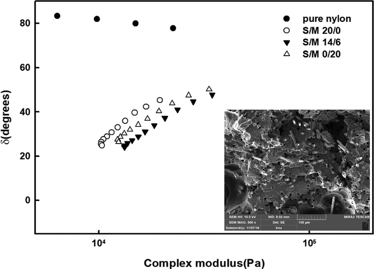 Figure 2 Van Gurp-Palmen analysis of nylon 66/CB/CNT/BIS/Ni-CF composites. The SEM picture is for the composite fabricated by side feeder. |