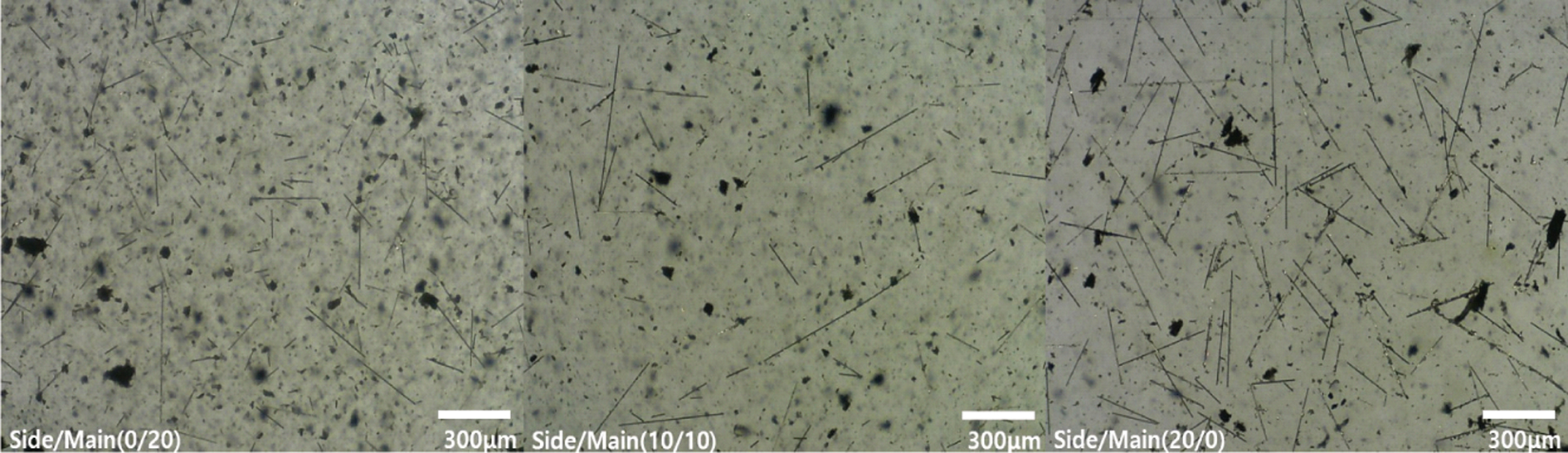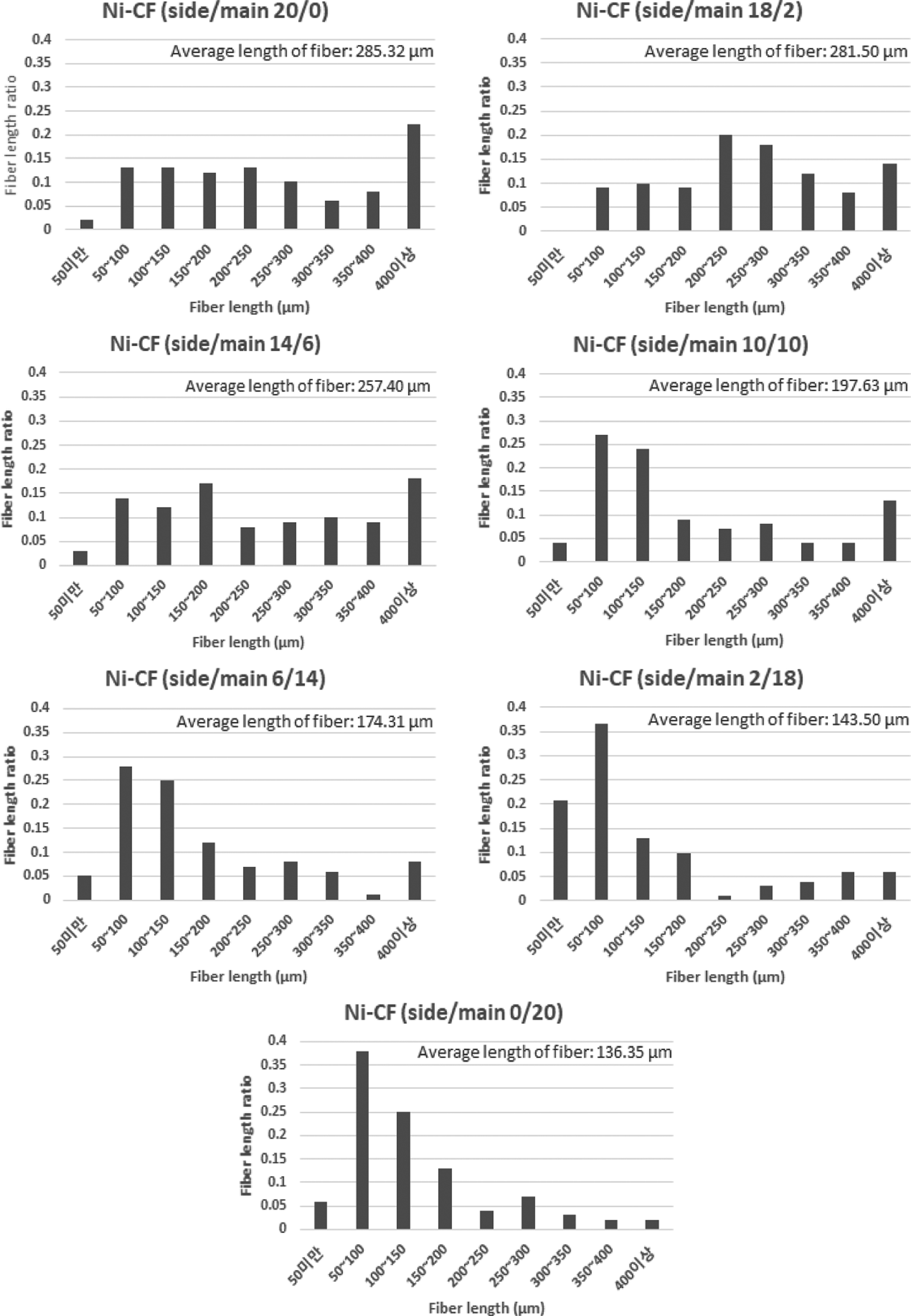 Ni-CF 부/주 투입 비에 따른 복합체 내의 섬유 길이 변화를 확인하기 위하여 복합체를 포름산에 녹여 OM을 사용하여 이미지를 측정하여 Figure 3에 나타내었다. 부 투입구에 섬유가 투입되는 양이 증가할수록 섬유의 길이가 증가하였고, 섬유의 길이와 평균길이를 측정하여 Figure 4에 분포도 형태로 나타내었다. 수치적으로도 부 투입구에 투입되는 탄소섬유 증가 시 장섬유의 비율이 상승하였다. 이는 섬유가 주 투입구에 투입될 시 스크류와 매트릭스의 전단력을 받는 시간이 증가하여 파괴가 일어나 짧아지는 것이며, 부 투입구에 투입 시 전단력을 받는 시간이 줄어 장섬유의 형태가 유지되는 것이다.