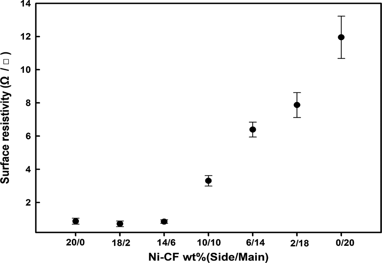 다음으로 부/주 투입구 투입비율에 따라 제조한 복합체의 표면저항을 측정하여 Figure 5에 나타내었다. 기존 연구결과에20,21 따르면, 고분자 복합체의 표면저항은 전기적 네트워크 구조의 영향이 큰 것으로 연구되었는데, 섬유의 길이가 증가하면 종횡비가 증가하여 네트워크 형성에 유리하며, 이러한 이유로 부 투입구의 투입비율이 증가하면 장섬유의 비중이 커져서 낮은 표면저항 값을 보이는 것으로 판단된다. 부/주 투입비율이 14/6까지는 표면저항이 낮은 값을 유지하지만 부/주 투입비율이 10/10부터는 급격하게 증가하였는데 이는 장섬유의 비율이 줄어 네트워크를 형성하여 전기적 경로를 확보하는 것이 쉽지 않기 때문이다.