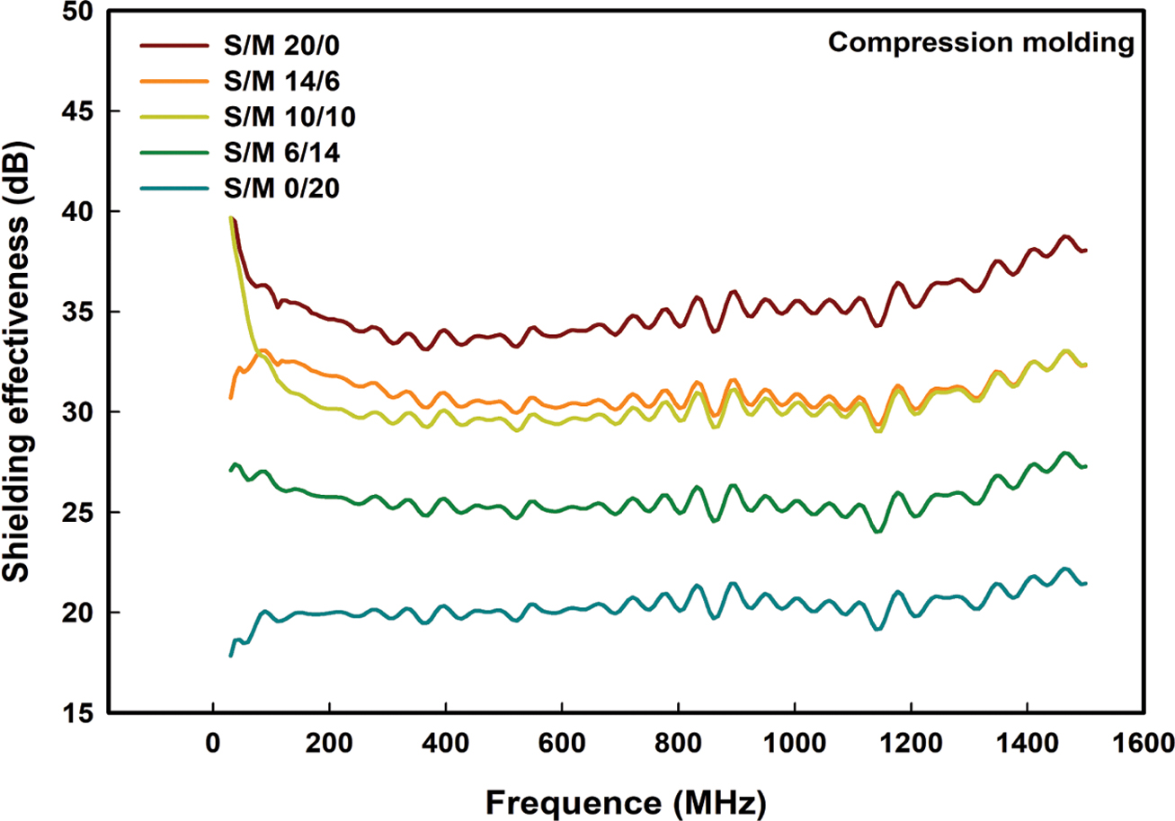 Figure 6 EMI shielding effectiveness of nylon66/CB/CNT/BIS/Ni-CF composites as a function of feeding ratio. |