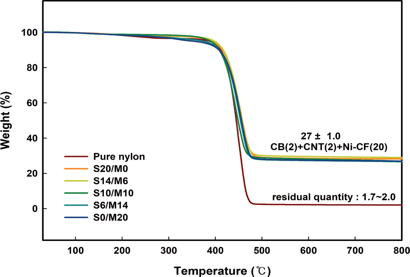 Figure 7은 탄소섬유 부/주 투입구 투입비율에 대한 복합체의 열안정성과 무기물 필러 함량을 열중량 분석기를 통하여 나타낸 것이다. 복합체의 열안정성은 나일론과 비교하여 큰 차이가 없으며, 분해온도(Td)는 전체 무게에서 무게 손실이 약 5% 되었을 때를 측정한 것이다. 순수 나일론의 경우 Td가 389 ℃, 부/주 투입구 투입비율에 따른 복합체의 경우 387-394 ℃로 나타난 것으로 보아 탄소섬유 부/주 투입구 투입비율이 분해온도에는 큰 영향을 미치지 않는 것으로 확인되었다. 또한 열분해 후 잔류 무게는 부/주 투입구 비율에 따라 큰 차이를 보이지 않으며, 약 27 wt%를 나타내는데, 이는 CNT, CB 및 나일론 자체 잔량 등을 고려하였을 때 Ni-CF는 21 wt% 정도로 투입량인 20 wt%와 큰 차이를 보이지 않는다.