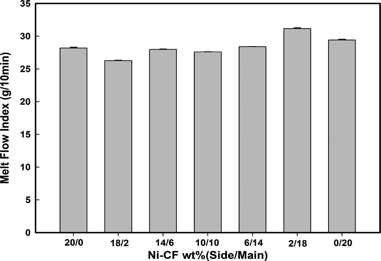 Figure 8은 탄소섬유 부/주 투입구 투입비율에 따른 나일론66/전도성필러 복합체의 용융흐름지수를 나타낸 것이다. 용융흐름지수는 섬유의 투입 위치에 따른 이축 압출기 내의 전단력의 차이가 발생하여 분자량에 영향을 주는지 간접적으로 확인하기 위하여 측정하였으며, 용융흐름지수가 모든 복합체의 조성에서 큰 차이가 없어 섬유의 투입 비율이 분자량에 영향을 주지 않았다.