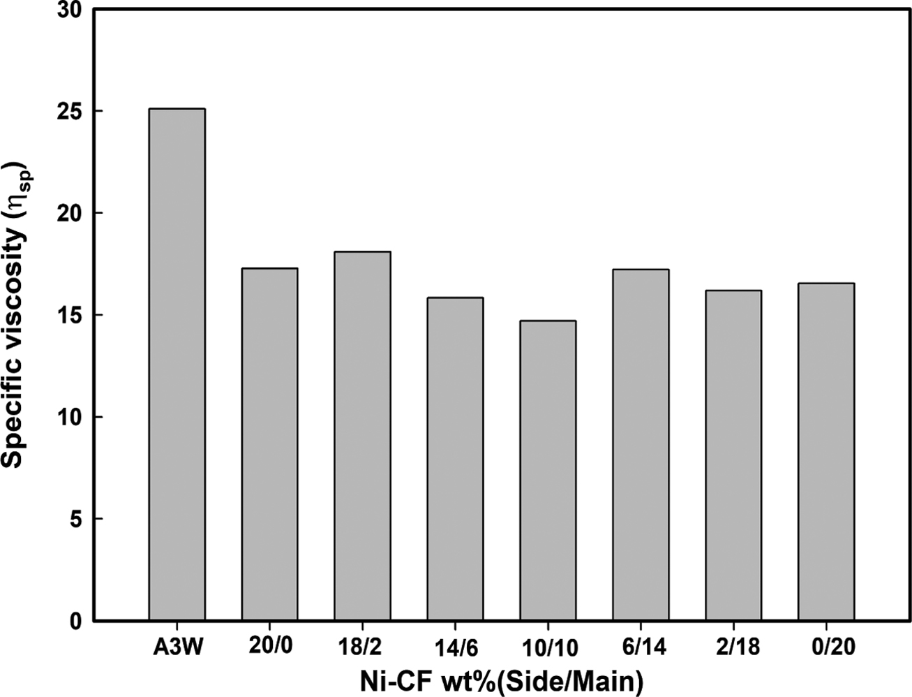 Figure 9 Specific viscosities of nylon66/CB/CNT/BIS/Ni-CF composites as a function of feeding ratio. |