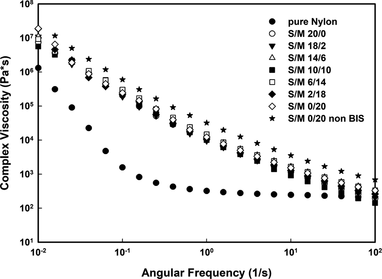 Figure 10 Complex viscosities of nylon66/CB/CNT/BIS/Ni-CF composites as a function of feeding ratio. |