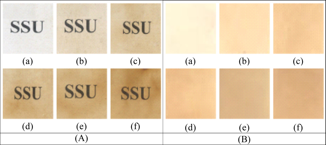 Figure 1 Pictures of the (A) amorphous; (B) annealed PPS films irradiated with UV light of 315 nm at 40 oC for (a) 0; (b) 1; (c) 3; (d) 6; (e) 12; (f) 24 h. |