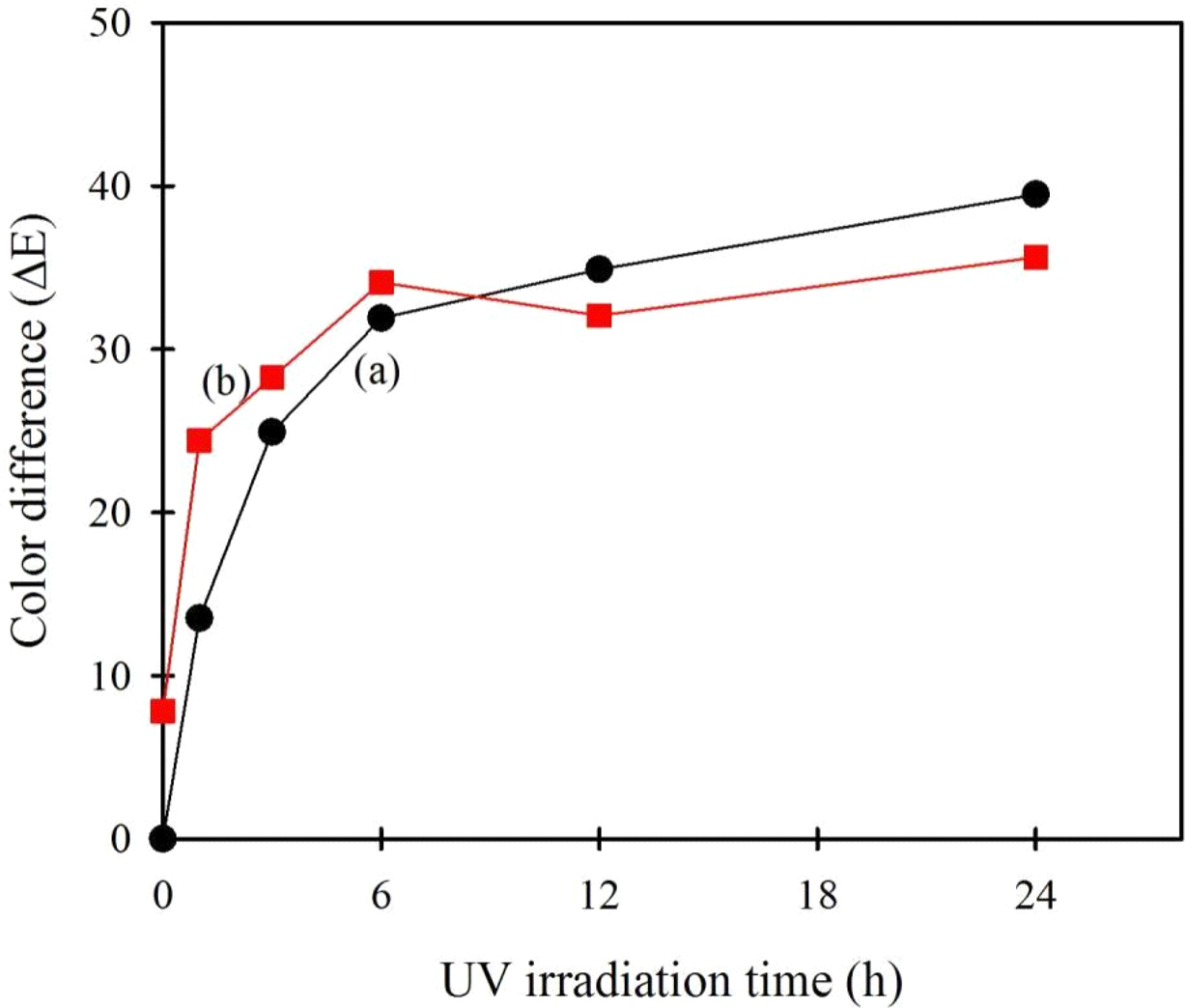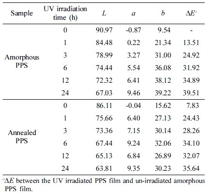 Table 1 Table 1. Color Values (L, a, b) and Color Differences (ΔE) of the PPS Films Irradiated with UV Light at 40 oC for Various Times |