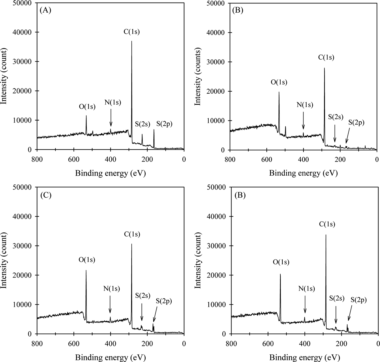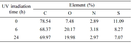PPS에 자외선을 조사시키면, 조사 초기에 산소원자 함량이 급격히 증가하며 6시간 이상 조사시키면 그 함량이 약 20%까지 증가하여 많은 산소원자가 PPS에 도입되었음을 알았다. 산소원자 함량 증가와 함께 탄소원자와 황원자 함량은 감소하였으며, 반면에 질소원자 함량은 약 3% 정도로 큰 차이 없이 비슷한 값을 유지하였다.