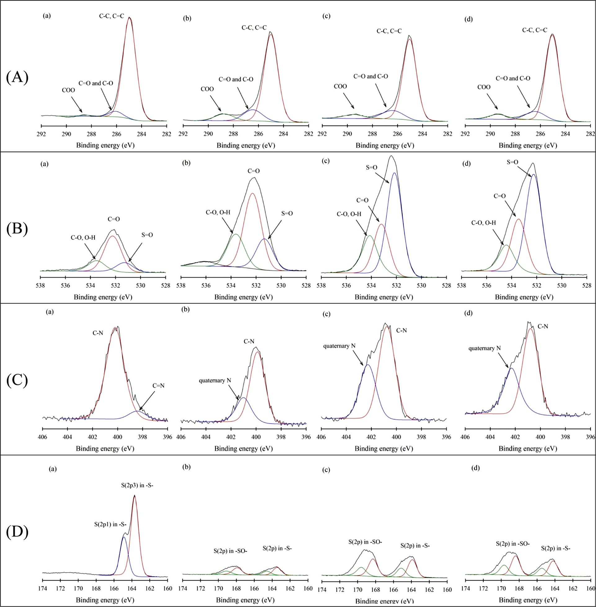 Figure 4 XPS peaks due to (A) C(1s); (B) O(1s); (C) N(1s); (D) S(2p) of PPS films irradiated with UV light for (a) 0; (b) 1; (c) 6; (d) 24 h. |