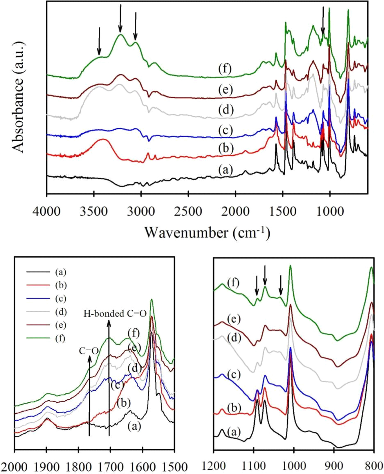 Figure 5 FTIR ATR spectra of the amorphous PPS films irradiated with UV light for (a) 0; (b) 1; (c) 3; (d) 6; (e) 12; (f) 24 h. |