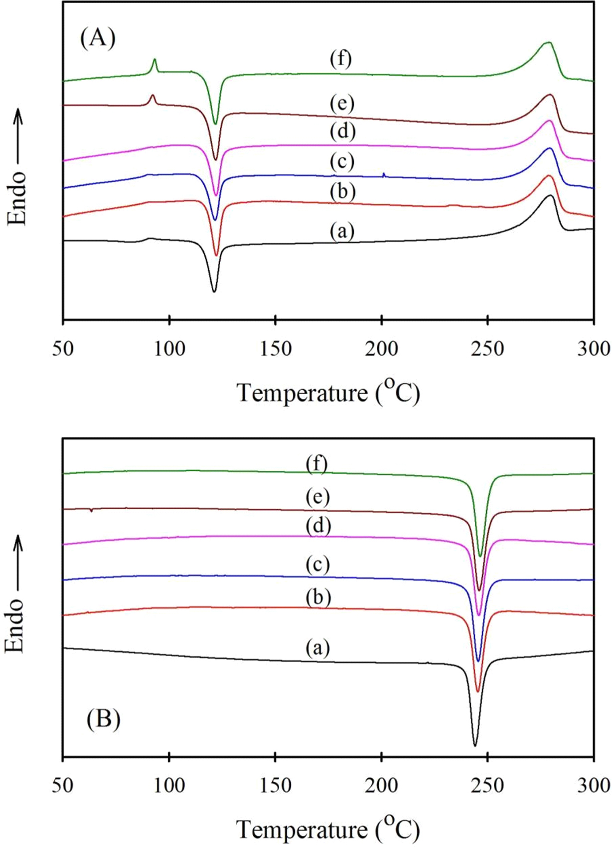 Figure 6 DSC curves of (A) heating; (B) cooling from the molten state of the amorphous PPS films irradiated with UV light for (a) 0; (b) 1; (c) 3; (d) 6; (e) 12; (f) 24 h. |