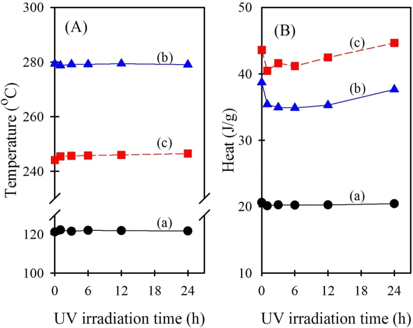 Figure 7 Changes in (A) the transition temperature of (a) Tcc; (b) Tm; (c) Tmc; (B) the transition enthalpy of (a) cold crystallization (ΔHcc); (b) melting (ΔHm); (c) melt crystallization (ΔHmc) of the amorphous PPS films according to UV irradiation time. |