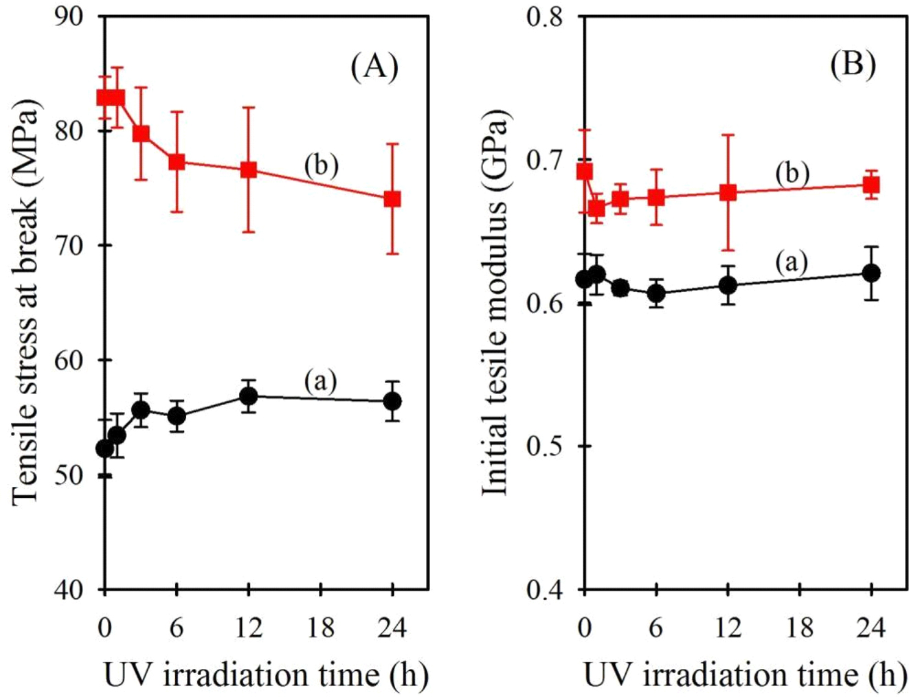 Figure 8 (A) Tensile stress at break; (B) initial tensile modulus of the (a) amorphous; (b) annealed PPS films irradiated with UV light for different times. |