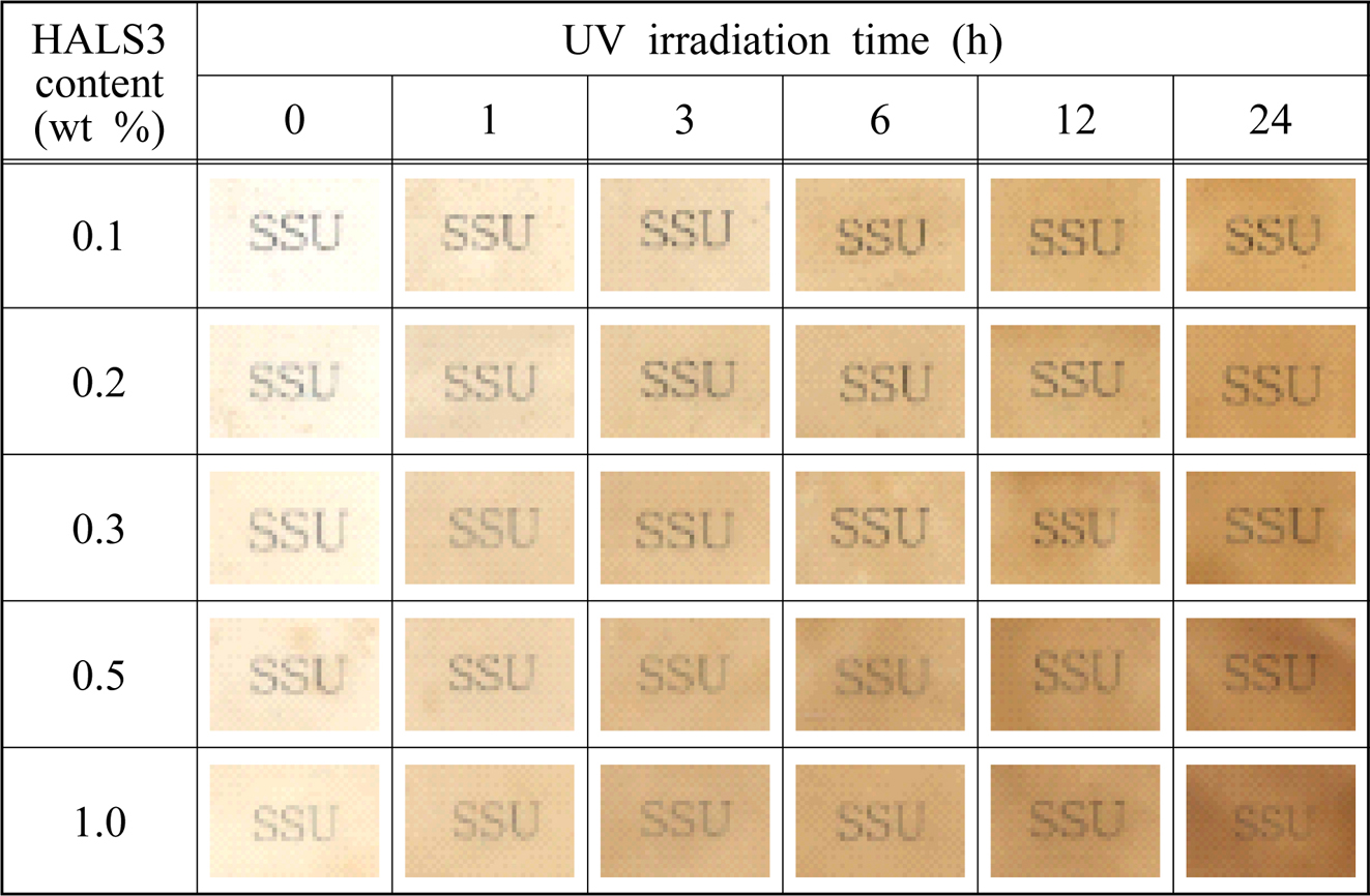 이상의 색차와 FTIR 결과로부터 HALS3을 첨가하여 자외선에 의한 PPS의 구조 변화를 줄이기 위해서는 0.3% 이상의 HALS3를 첨가해야 하며, 자외선에 의한 PPS의 황변현상은 PPS 주사슬의 구조변화에 의한 것만은 아니라는 것을 알았다.