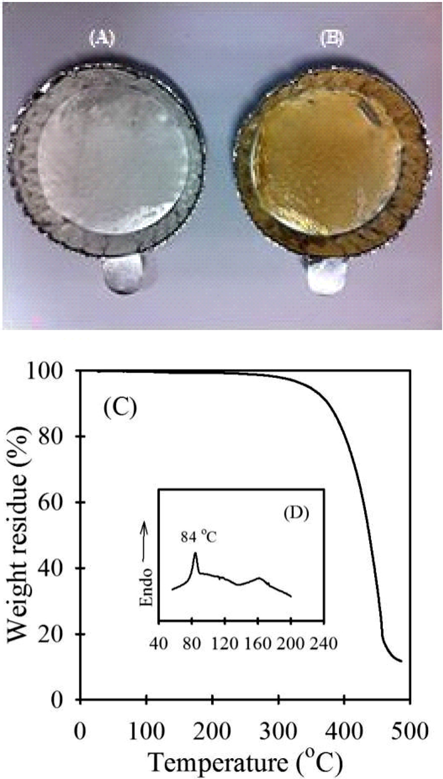 Figure 10 Pictures of HALS3 (A) before; (B) after UV irradiation at 40 oC for 24 h; (C) TGA; (D) DSC thermogram of HALS3. |