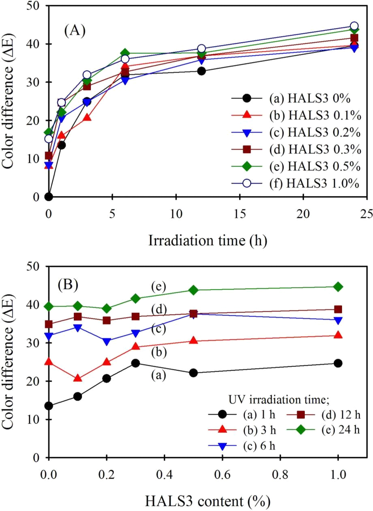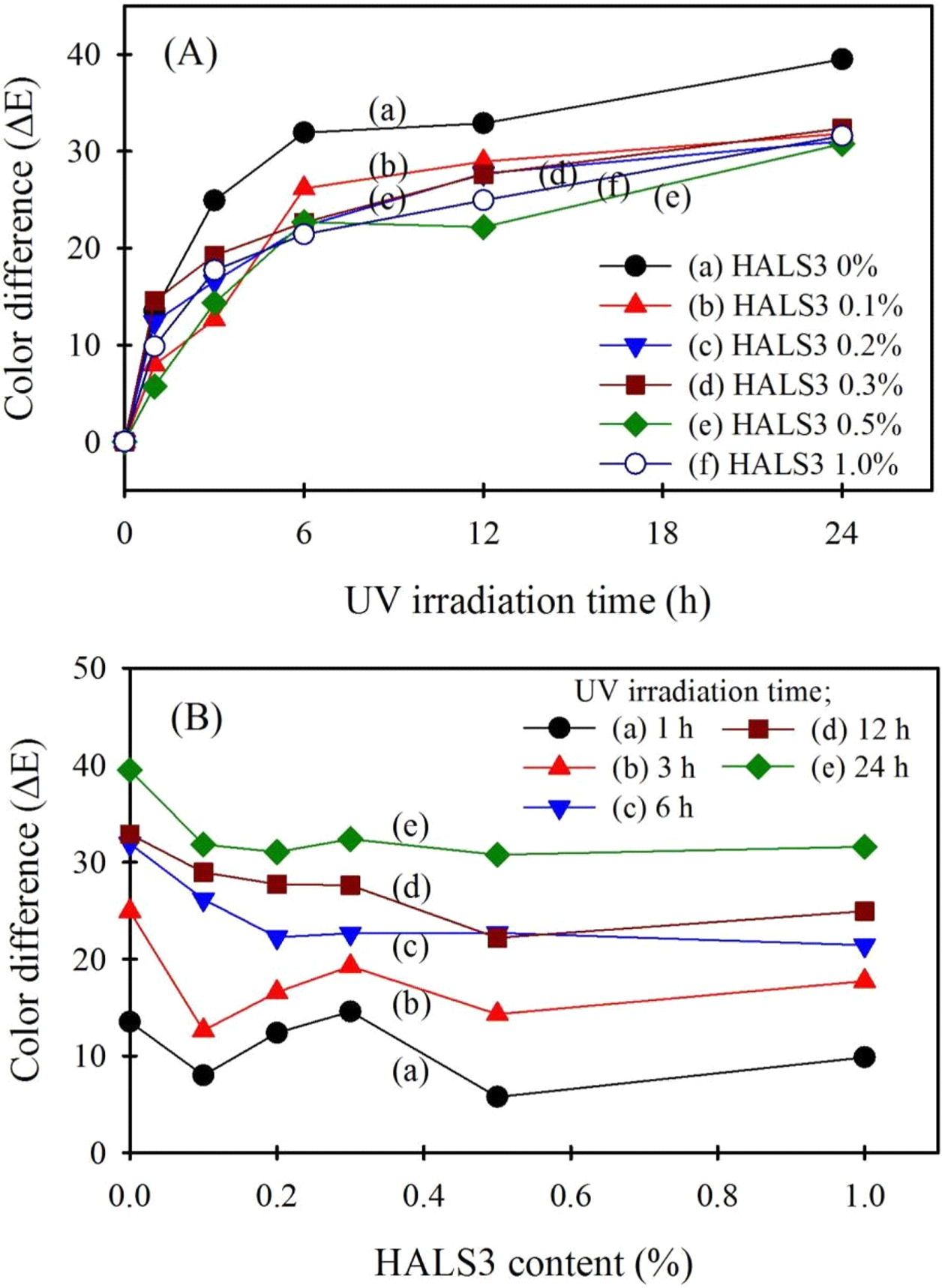 Figure 12 Changes in the color difference (ΔE) between the UV irradiated amorphous PPS/HALS3 film and the un-irradiated one containing the same HALS3 content (A) with increasing irradiation time at constant HALS3 content; (B) with increasing HALS3 content at constant UV irradiation time. |