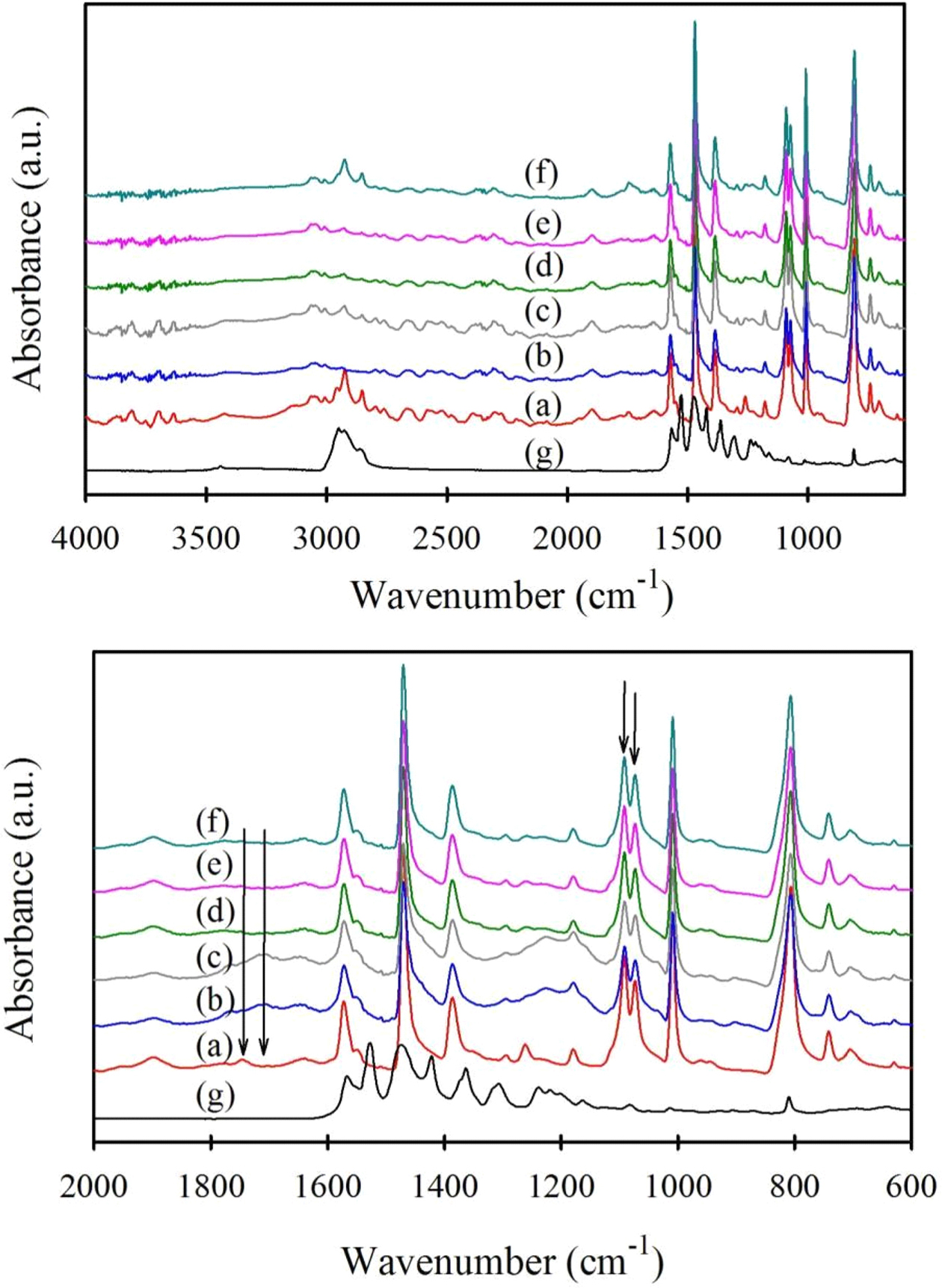 Figure 13 FTIR ATR spectra of the amorphous PPS/HALS3 films irradiated with UV light for 24 h. HALS3 content (%): (a) 0 (neat PPS); (b) 0.1; (c) 0.2; (d) 0.3; (e) 0.5; (f) 1.0; (g) 100 (HALS3). |