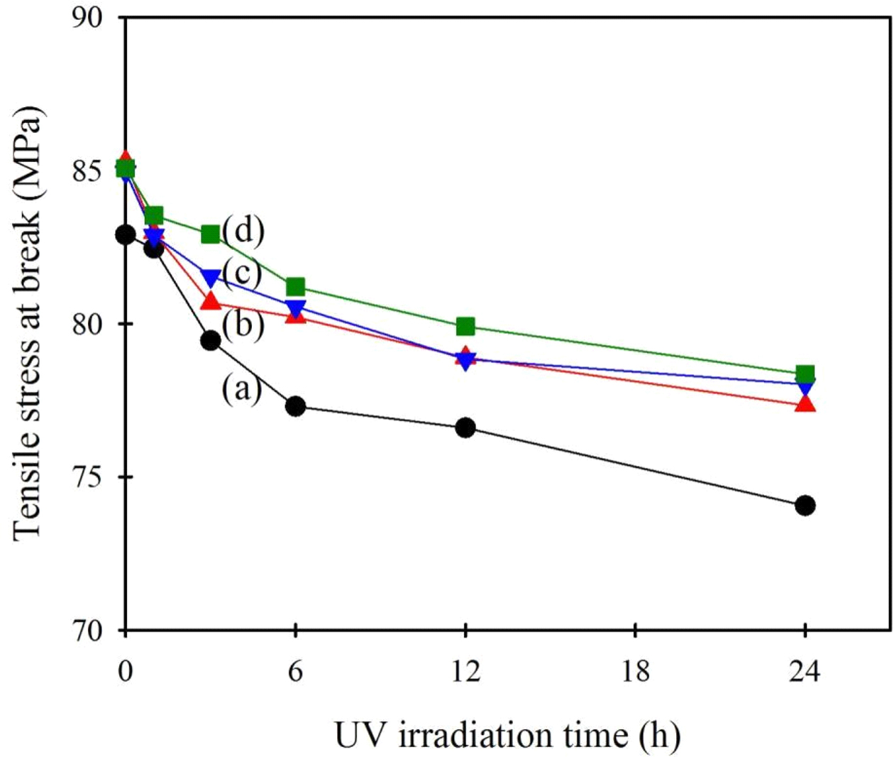 HALS3 첨가가 자외선 조사시킨 시료들의 물성에 어떤 영향을 미치는지 알아보기 위하여, HALS3 함량을 0.3%까지로 한 시료들을 서로 다른 시간 동안 자외선에 조사시킨 후 이들의 파단 인장응력을 구하였다. 이때 열처리하지 않은 무정형 시료들은 충분한 강도를 나타내지 않기 때문에 160 oC에서 1시간 열처리시킨 필름 시료들을 사용하였다. Figure 14는 각각 HALS3 함량을 일정하게 한 시료들의 자외선 조사시간에 따른 파단응력 변화를 나타낸 것이다. 자외선 조사 전 열처리시킨 순수 PPS 필름 시료는 약 83 MPa의 파단 인장응력을, HALS3을 첨가한 필름시료들은 이보다 약간 높은 85 MPa 정도의 파단 인장응력을 나타내었다. 순수 PPS 필름 시료를 자외선에 조사시키면 자외선 조사시간이 길어질수록 파단 인장응력이 감소하여 24시간 동안 자외선에 조사시킨 후에는 그 값이 약 74 MPa로 감소하였다. HALS3을 첨가한 시료들의 파단 인장응력도 자외선 조사시간이 길어짐에 따라 점차 감소하였지만 전체적으로 순수 PPS 필름보다 높은 값을 나타내었으며, HALS3 함량이 많아질수록 파단 인장응력 감소폭이 작아 HALS3 첨가가 강도 저하를 크게 줄인다는 것을 알았다.