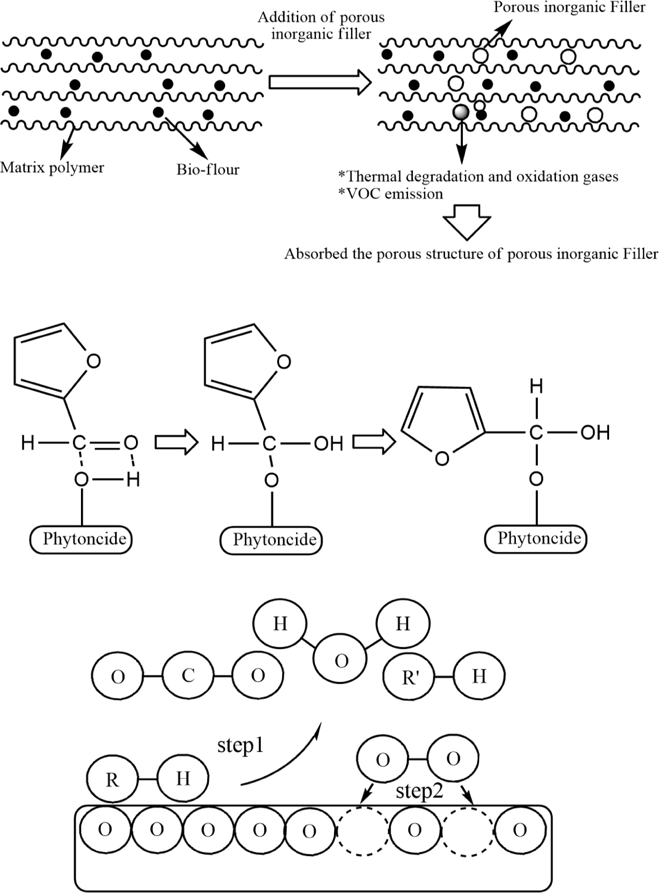 일반적으로 냄새 유발 물질을 제거하기 위한 방안으로는 감각적 방법(마스킹법), 생물학적 방법, 물리적 방법, 화학적 방법 등이 있다. 본 연구실과9 Kim 등은7,8 천연섬유의 냄새 저감을 위하여 물리적인 방법인 다공성 무기물의 흡착을 적용한 연구를 일부 진행하여 VOC의 일부 감소 및 냄새 수준 저감을 확인하였으나 다공성 무기물의 첨가로 인해 흡습성이 증가하는 문제를 유발하였다. 흡수율을 낮게 유지하면서 냄새 개선을 나타내는 효율적 방법으로 피톤치드, 금속산화물 촉매 같은 화학적인 방법이 있으나 BF와 같은 천연섬유에 대한 연구가 거의 없는 실정이다. 따라서 본 연구에서는 PP/BF 복합체의 냄새 개선을 위해 비교를 위한 다공성 무기물 그리고 피톤치드와 금속산화물 촉매를 적용하고 기계적 물성, 흡습성, 푸르푸랄 및 VOC에 대한 가스 크로마토그래피 질량분석(GC-MS) 냄새 수준 평가 등을 통해 주요 물성에 대한 냄새 저감제의 영향을 고찰하였다. 다공성 무기물에 의한 흡착, 피톤치드에 의한 소취반응, 금속산화물 촉매의 Mars-Van Krevelen(MVK) 메커니즘과 같은 VOC 및 냄새 물질 제거 메커니즘을 다음의 Figure 1에 나타내었다.