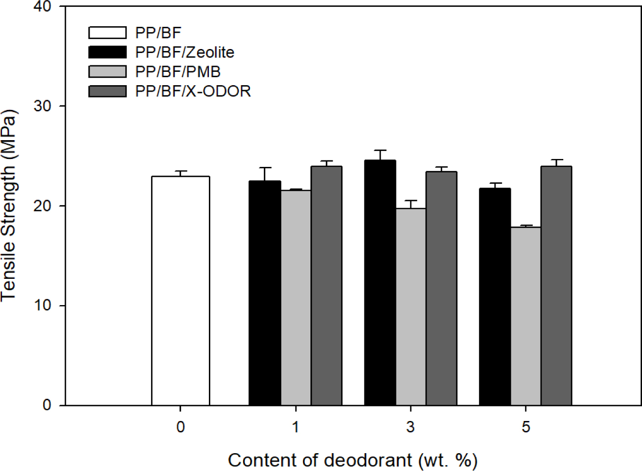 PP/BF 복합체에 다공성 무기물인 제올라이트와 화학적 저감제의 종류 및 함량에 따른 PP/BF 복합체의 인장강도, 굴곡강도 및 아이조드 충격강도를 Figure 2, Figure 3, Figure 4에 각각 나타내었다.