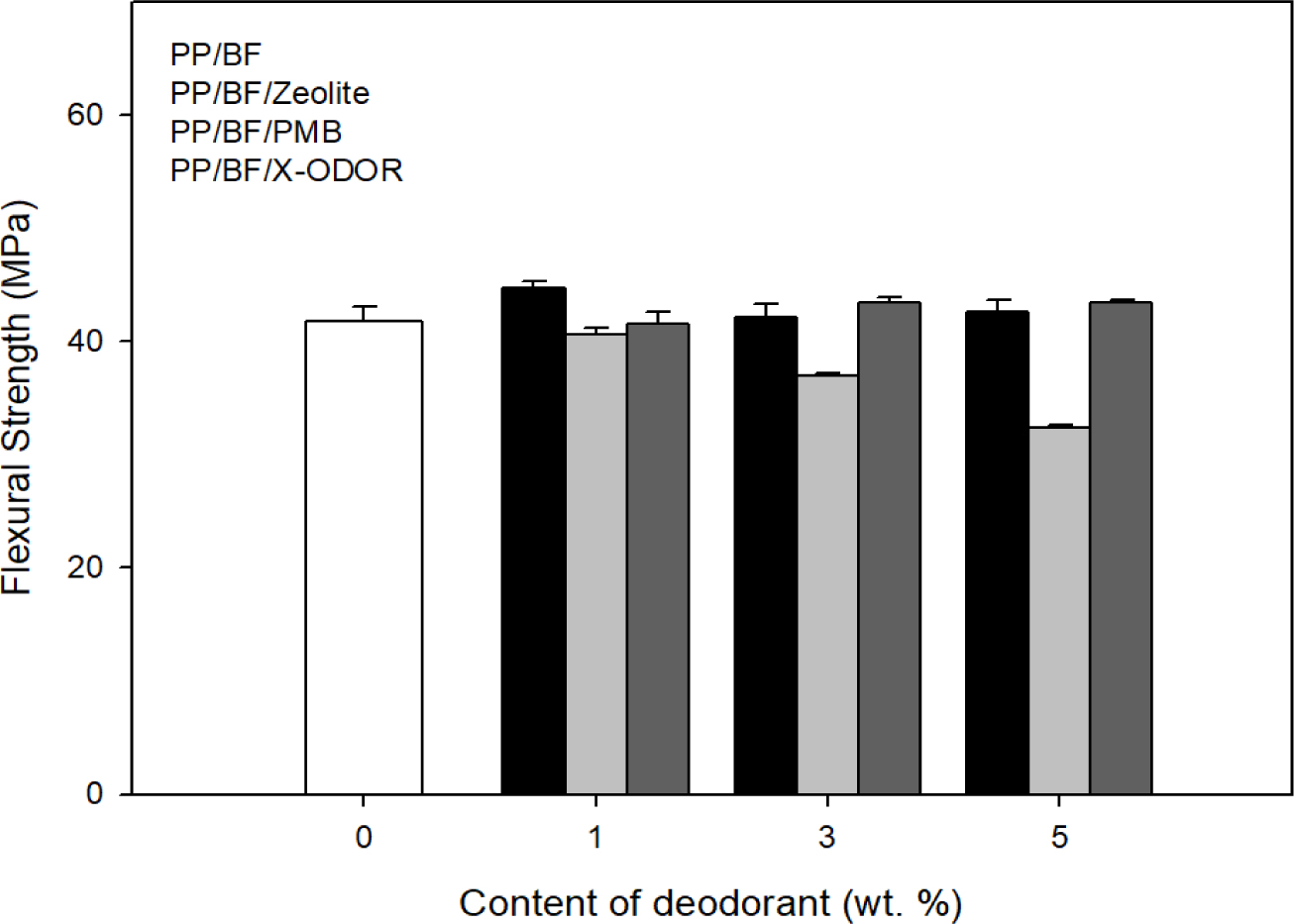 Figure 3 Flexural strength of PP/BF composite as a function of deodorant content. |