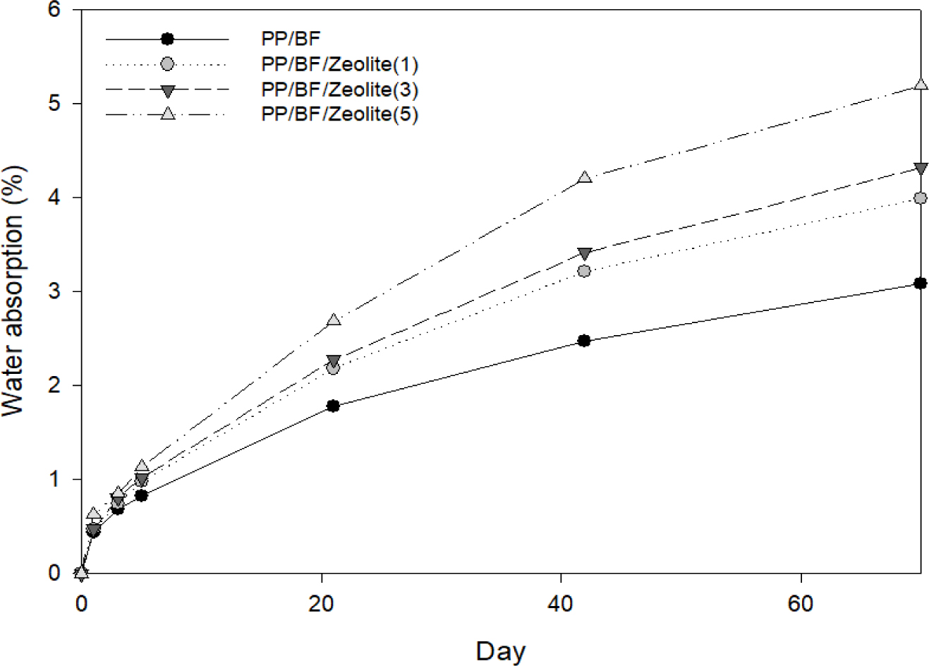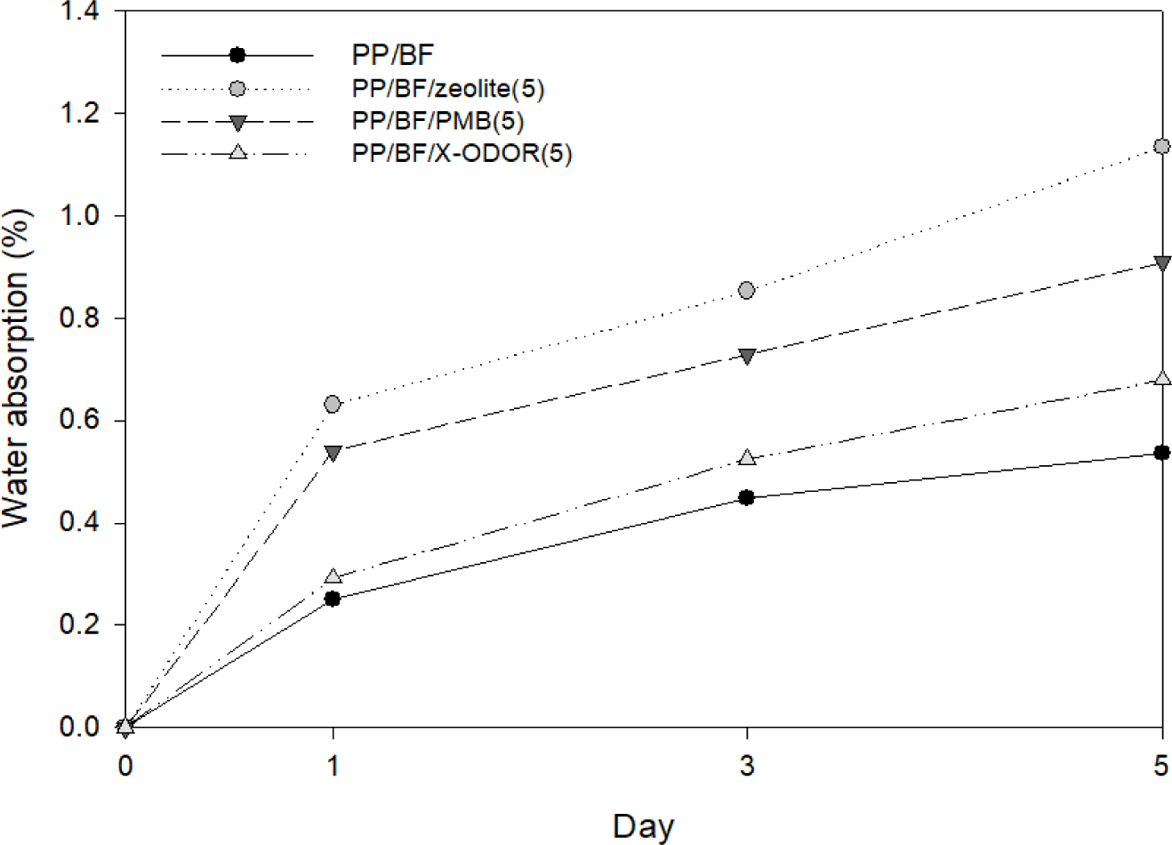 PP/BF 복합체의 수분 흡수는 사출성형 시 기포 형성과 성형 후 제품의 두께 팽창(치수안정성) 등에 영향을 줄 수 있기 때문에 흡습성에 대한 고려가 필수적이며,14 특히 제올라이트의 경우 다공성 구조로 공극을 통한 공기 중의 수분을 흡수할 가능성이 높기 때문에 흡습성에 대한 실험을 진행하여 Figure 5에 나타내었다. 다공성 무기물이 적용되지 않은 PP/BF 복합체와 비교할 때 제올라이트가 PP/BF 복합체의 물 흡수율이 증가하였으며, 다공성 무기물의 함량이 증가할수록 물 흡수율이 크게 증가하였다. 냄새 저감제로 다공성 무기물을 적용할 때는 가공을 위해서는 사출 가공 시 건조 과정 및 제품 생산 후 보관에 대한 주의가 필요할 것으로 판단된다.