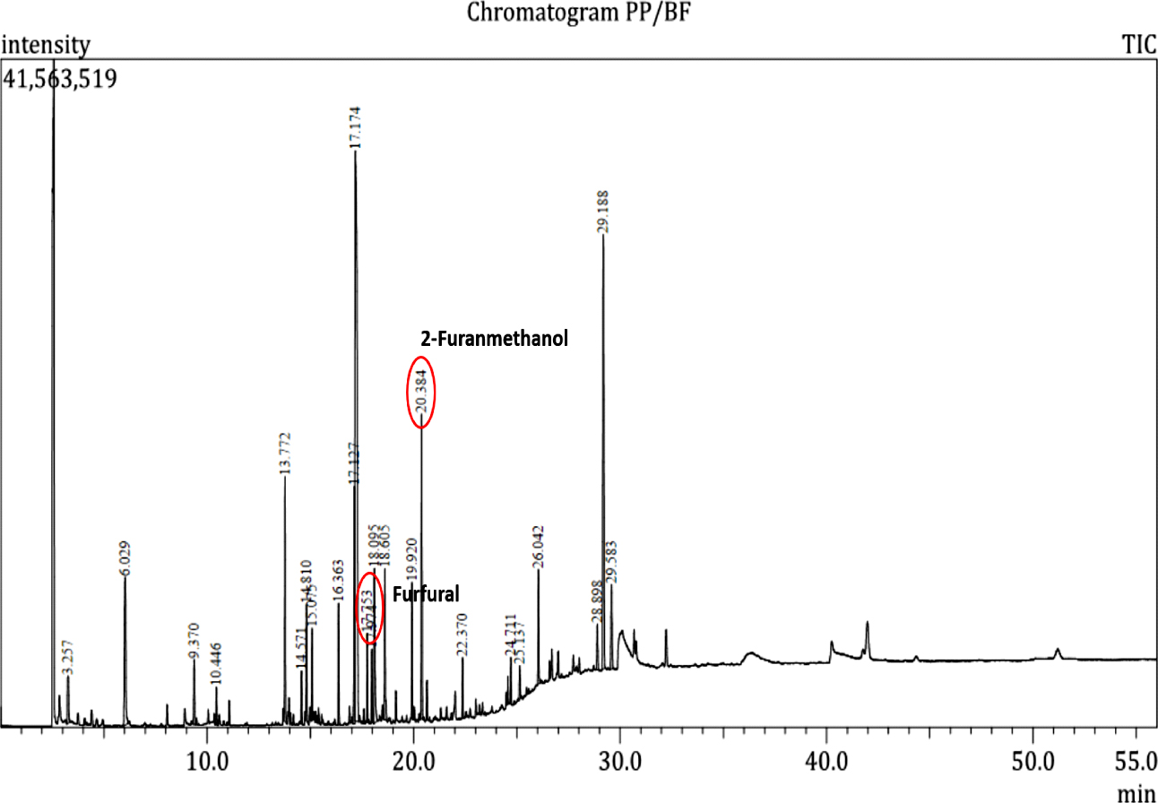 BF와 같은 천연섬유는 구성 성분 중 헤미셀룰로오스, 리그닌 등의 분해에 의해 발생하는 푸르푸랄, furfuryl alcohol(2-furanmethanol, C5H6O2) 등이 냄새의 주원인으로 알려져 있고,15 특히 푸르푸랄은 땅콩류의 구수한 냄새를 나타내어 PP/BF 복합체 냄새의 주원인 물질로 고려되고 있다.