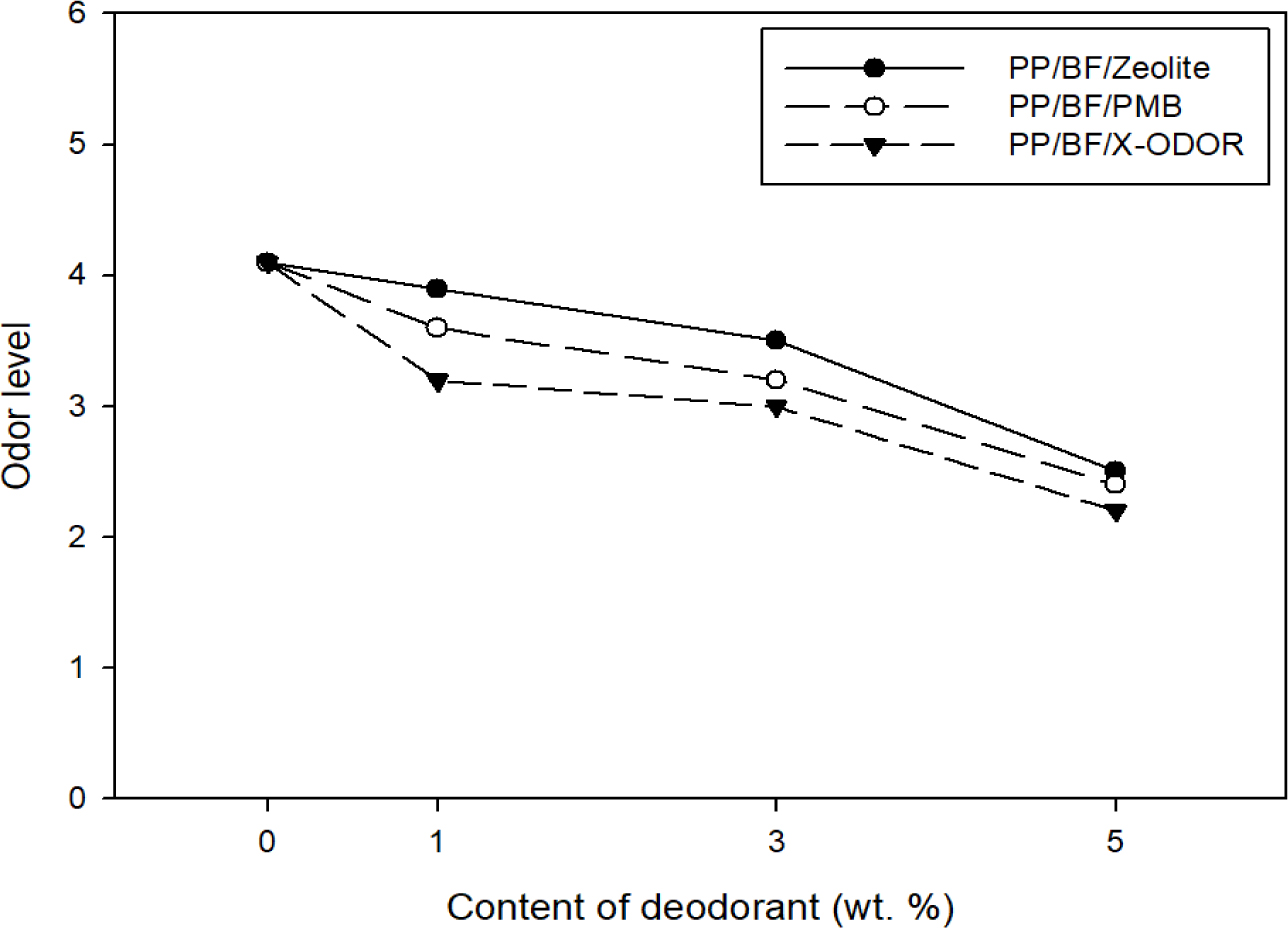 Figure 8 Odor level of PP/BF composites with three different types of deodorant. |