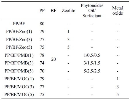 재료. 폴리프로필렌(PP)은 대한유화공업(주)의 CB5290과 SK종합화학의 BX3800을 50/50 비율(wt%)로 혼합하여 사용하였고, 대나무 섬유(BF)는 (주)한양소재에서 200 µm 길이의 파우더 형태 제품을 제공받아 사용하였다. 다공성 무기물은 WAKO의 제올라이트(비표면적 0.2797 m2/g, 기공 크기 2.734 nm)를 사용하였으며, 피톤치드는 피톤치드 마이크로캡슐((주)피톤치드환경, 액상슬러리), 프로세싱 오일(극동유화의 파라핀계(LP150F)) 및 계면활성제의 마스터배치(master-batch, MB)형태로 사용하였다. 계면활성제는 시그마알드리치의 polyoxyethylene Lauryl ether(Brij® L4)를 사용하였고, 금속산화물 촉매는 MnO: 70-80%, CuO: 15-20%, 귀금속: 약 1%로 구성된 한소(주)의 X-ODOR 제품을 사용하였다. 금속산화물 촉매로 망간(Mn)과 구리(Cu) 혼합산화물을 이용한 이유는 VOC에 대한 기존의 연구 결과 이들 두 금속의 혼합 시 우수한 제거 효율을 나타내었기 때문이다.10,11