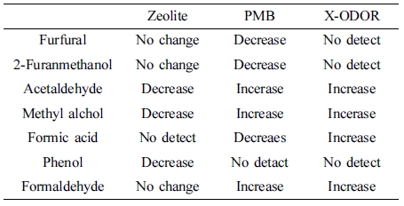우선 제올라이트를 PP/BF 복합체에 적용했을 때 흡착 효과로 인해 일부 VOC들이 감소하였으며,16 특히 제올라이트를 적용한 경우 아세트알데히드, 메틸알코올, 포름산 등의 감소가 크게 나타남을 확인하였다. 반면, 냄새의 주요 원인 물질인 푸르푸랄, furfuryl alcohol 등에는 유효한 수준의 변화가 관찰되지 않아 피톤치드 그리고 금속산화물 촉매에 대해서 추가적인 연구를 진행하였다. 피톤치드는 알파-파이넨(α-pinene), 베타-파이넨(β-pinene), 켐펜(camphene), 알파-테르파이넨(α-terpinene), 베타-테르파이넨(β-terpinene), 감마-테르파이넨(γ-terpinene), 베타-펠란드렌(β-phellandrene), 1,8-시네올(1,8-cineole), 알파-테르피놀렌(α-terpinolene) 및 델타-카디넨(δ-cadinene) 등 하나 이상의 주요한 유효성분을 포함하는 탈취성능 및 방향성의 특징을 갖는 것으로 알려져 있으며,16 PP/BF/PMB 복합체의 GC-MS 결과에서도 α-terpinyl acetate 등의 물질이 포함됨을 확인하였다. Table 2의 피톤치드에 대한 복합체의 GC-MS 측정 결과를 살펴보면 냄새 원인 물질로 알려진 푸르푸랄, furfuryl alcohol(2-furanmethanol)과 함께 포름산, 페놀 등이 감소하는 것을 확인할 수 있었으나, 알데히드, 메탄올 등과 같은 일부 VOC 물질이 증가하는 결과를 나타내었다. 마지막으로, 금속산화물 촉매를 적용한 PP/BF 복합체의 GC-MS 결과에서는 푸르푸랄, furfuryl alcohol(2-furanmethanol)이 거의 검출되지 않았으나, 일부 새로운 VOC와 함께 알데히드와 메탄올 등의 VOC들이 크게 증가하는 것이 관찰되었다. 금속산화물 촉매가 적용되었을 때 푸르푸랄(C5H4O2)와 furfuryl alcohol(2-furanmethanol, C5H6O2)의 경우 MVK 메커니즘에 따라 금속산화물 촉매 표면의 산소에 의한 산화 반응을 통하여 CO2, H2O 및 상대적으로 저분자인 VOC로 변하는 과정을 반복하면서 냄새 물질이 감소되는 것으로 해석된다.17