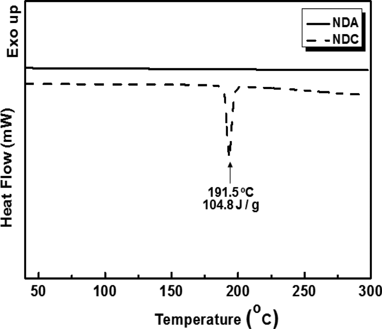 Melting behavior of resulting NDC was analyzed and compared with starting NDA. Clear melting point at 191.5 oC was observed for NDC while no melting was detected up to 300 oC for NDA. Our results are compatible with the previous reported other researchers data found in the literatures.37,39 It was found that NDA have superior thermal stability than NDC (Figure 2). From these results, it is concluded that NDA was successfully modified into NDC with a highly efficient reaction (97.7%).