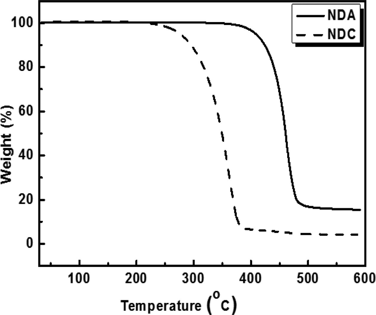 Figure 2 Thermal degradation behaviors of NDA and NDC. |